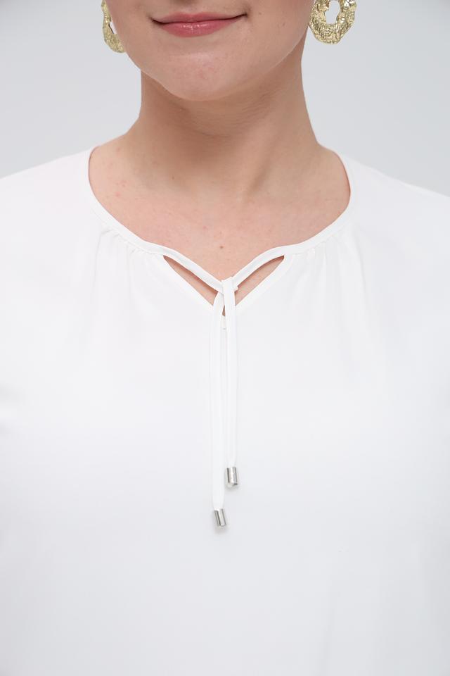 Блуза имеет короткие рукава и V-образный вырез, который украшен тонкими завязками, добавляющими образу игривости и женственности. Простой, но элегантный дизайн позволяет сочетать эту блузу с различными предметами гардероба – от классических брюк до юбок.