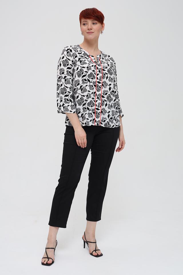 Блуза имеет свободный крой и короткие рукава, что обеспечивает свободу движений. Особенностью модели является яркий цветочный принт в черном цвете на белом фоне, а также контрастная розовая отделка по вырезу горловины и центру полочки.