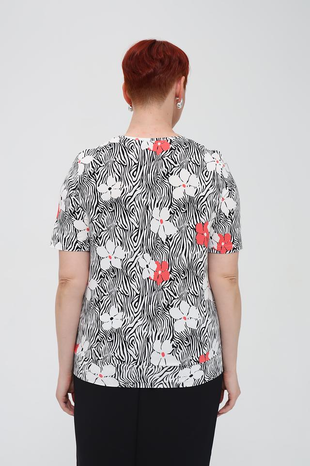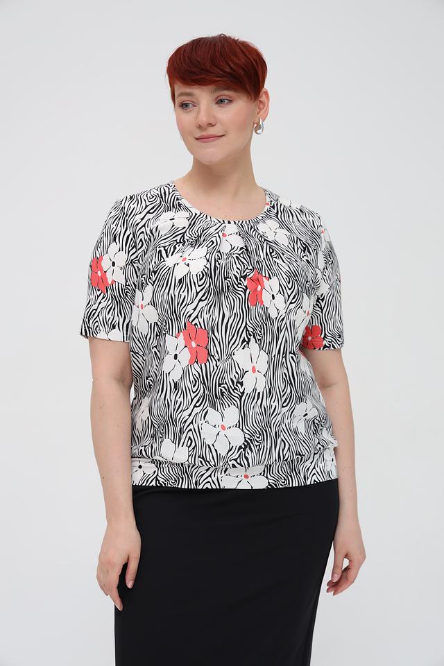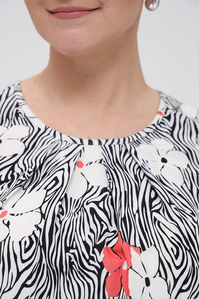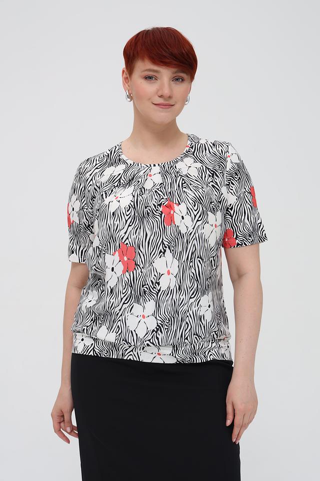 Модель имеет свободный крой, который не сковывает движений и обеспечивает комфорт в течение всего дня. Короткие рукава делают блузу подходящей для теплой погоды. Круглый вырез горловины подчеркивает линию шеи и декольте.