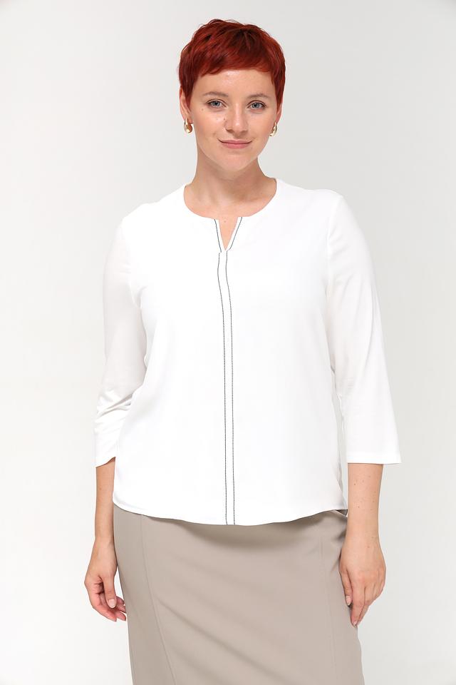 Блуза имеет прямой крой, который подчеркивает достоинства фигуры, не сковывая движений. Особенностью модели является деликатная вышивка вдоль планки, придающая ей изысканность и оригинальность.