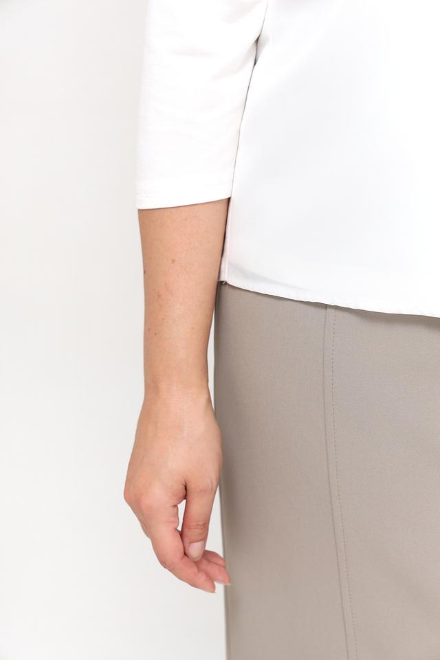 Рукава блузы – три четверти, что делает ее универсальной для любого времени года. Воротник – округлый, что придает образу мягкость и женственность.
