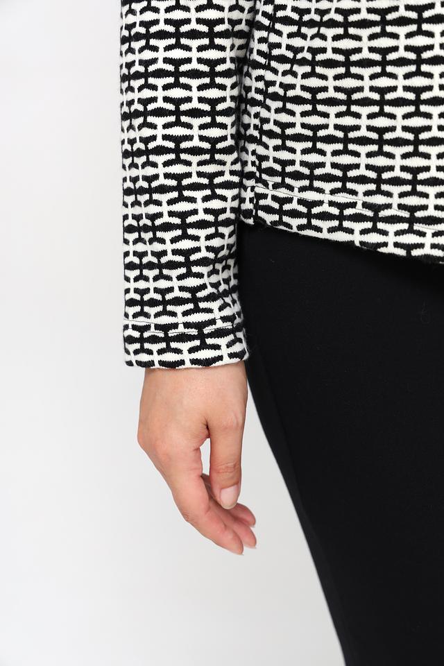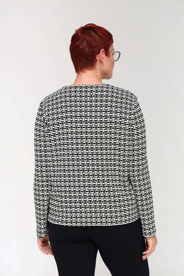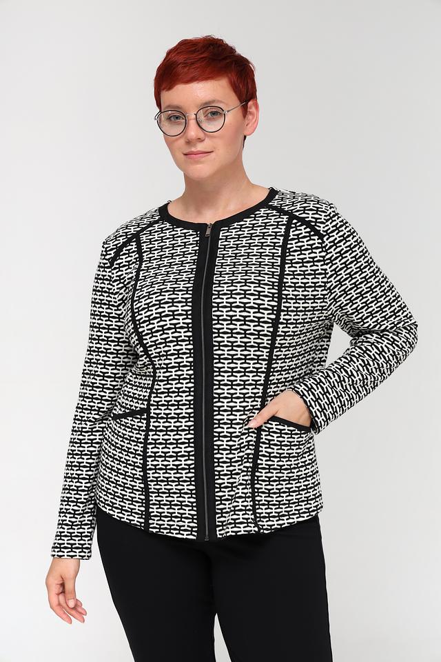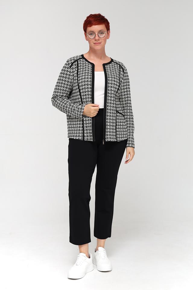 Жакет выполнен в чёрно-белой цветовой гамме с геометрическим принтом в виде клетки. Такой рисунок делает жакет универсальным и подходящим для создания различных образов – от деловых до повседневных.