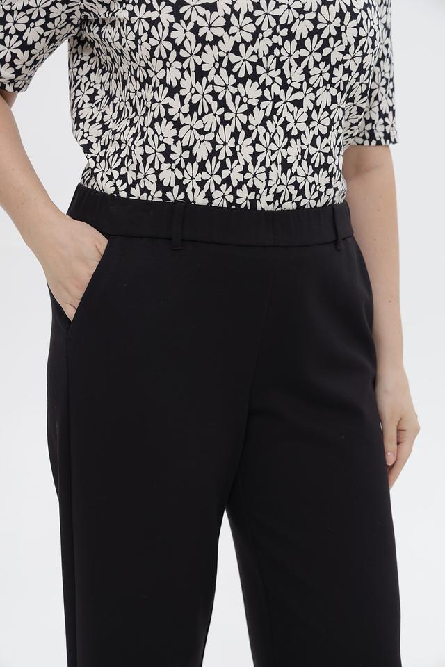 Состав ткани: 73% вискоза, 25% полиамид, 2% эластан. Эта комбинация материалов обеспечивает приятные тактильные ощущения, хорошую воздухопроницаемость и лёгкость в уходе. Брюки подойдут для создания как делового, так и повседневного образа.
