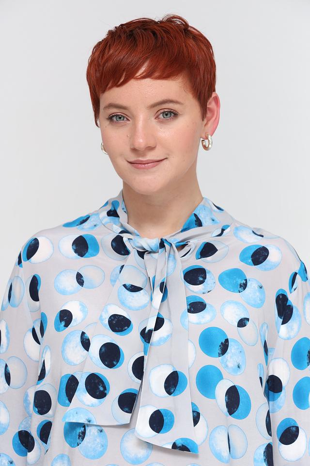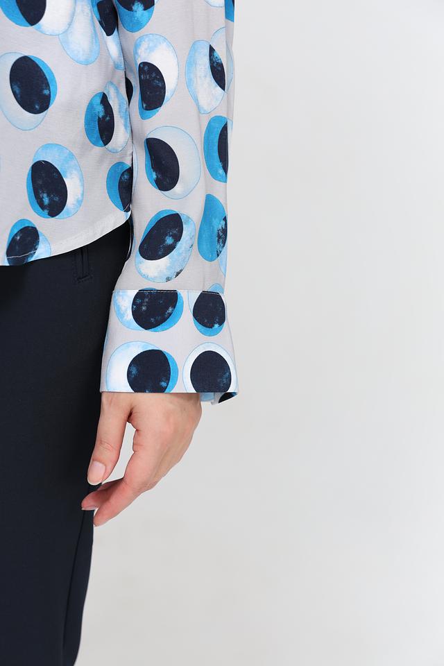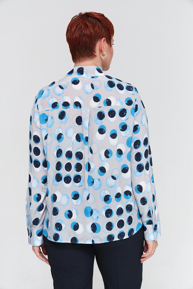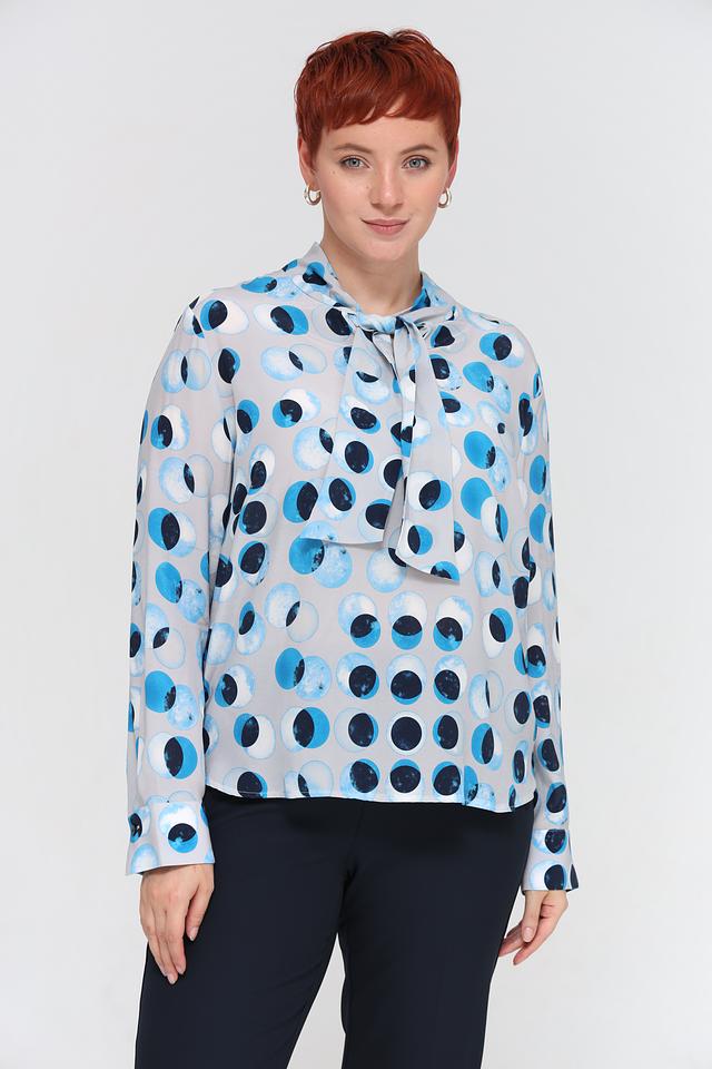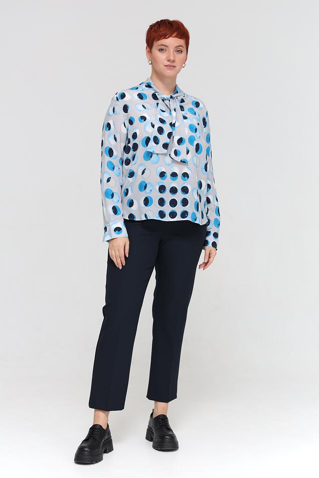 Блуза имеет лёгкий, струящийся силуэт и украшена ярким принтом в горошек, выполненным в голубых и тёмно-синих тонах на светло-сером фоне. Длинные рукава и V-образный вырез с завязками на шее позволяют создавать различные образы, от классических до более расслабленных.