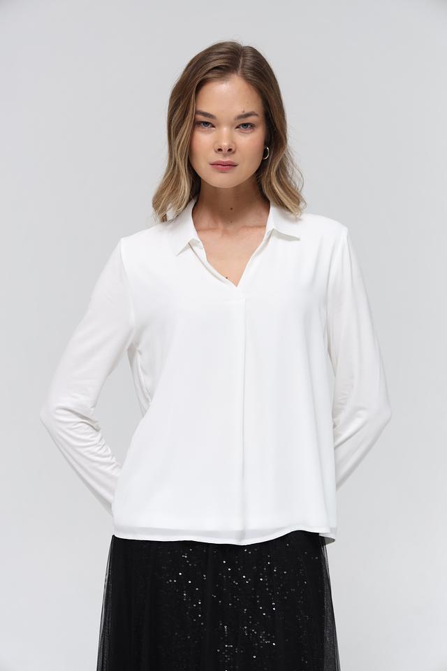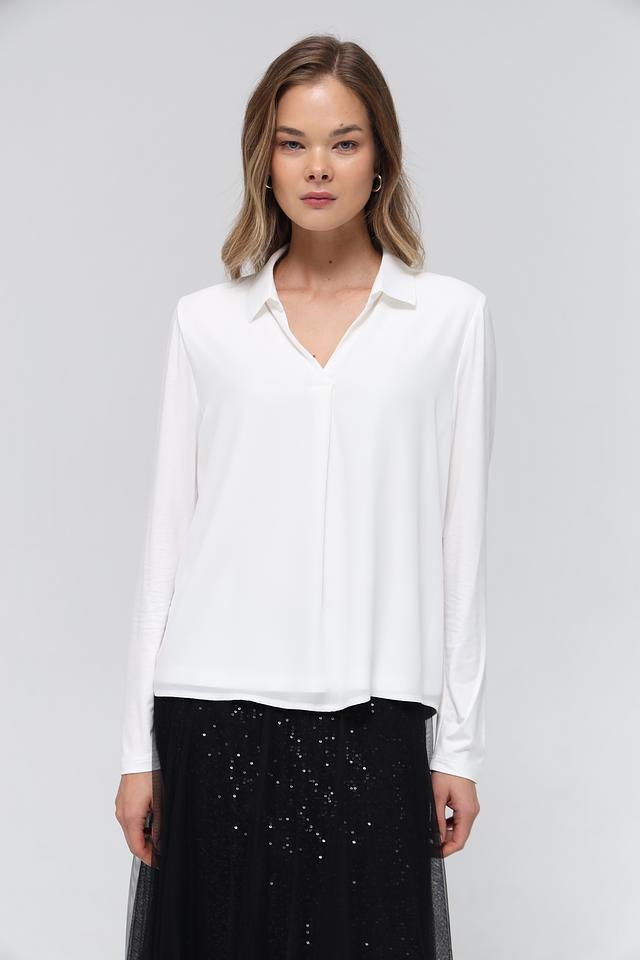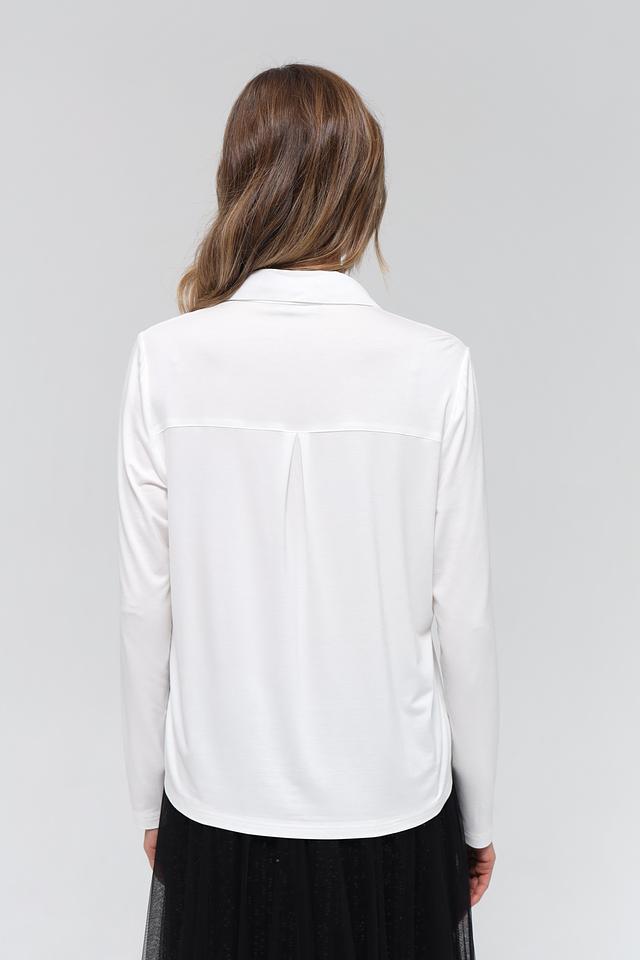 Блуза имеет прямой крой, длинные рукава и аккуратный воротник. Слегка заниженная линия плеч придает ей более расслабленный и современный вид. Небольшая сборка на груди создает легкую драпировку, добавляя блузе женственности.