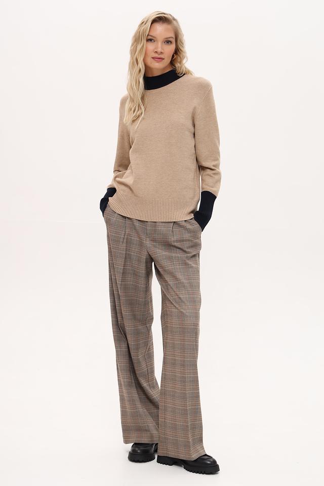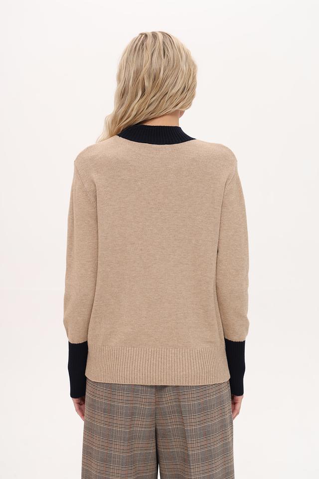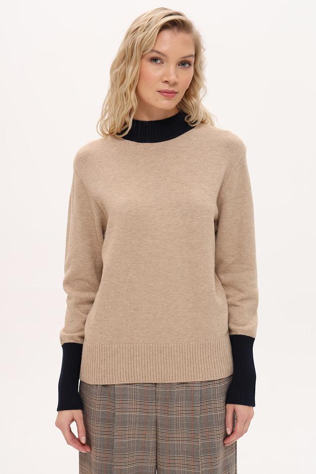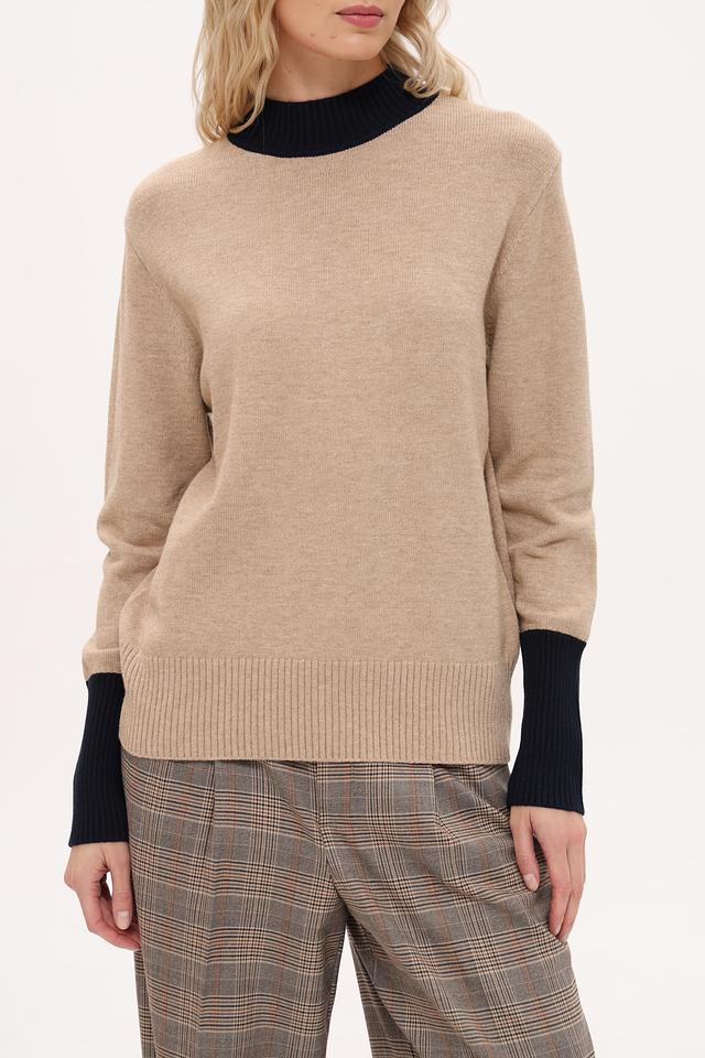 Особенностью данного пуловера является сочетание бежевого цвета основы с черной отделкой воротника и манжет. Это создает контрастный и стильный акцент, делая изделие более интересным и выразительным.