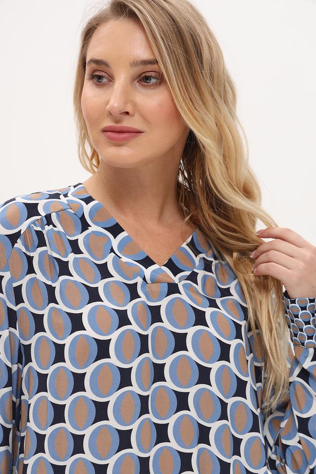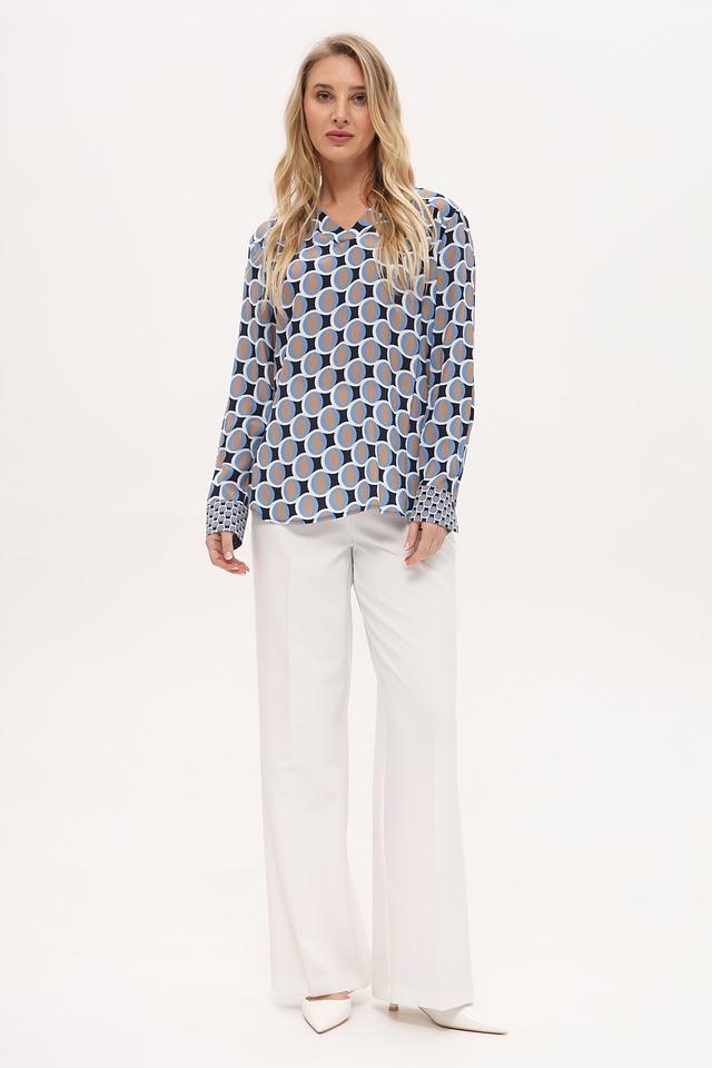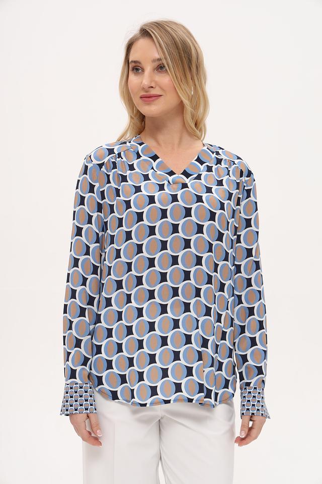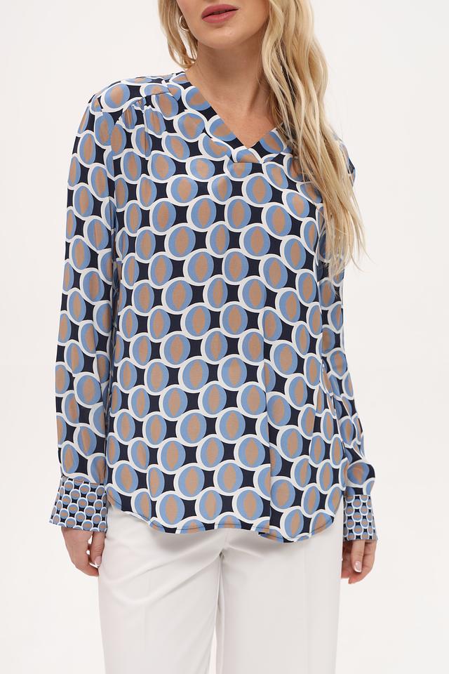 Блуза имеет свободный крой и длинные рукава с манжетами. V-образный вырез горловины подчеркивает женственность силуэта. Главная особенность модели – яркий геометрический принт, выполненный в синих, голубых и бежевых тонах.