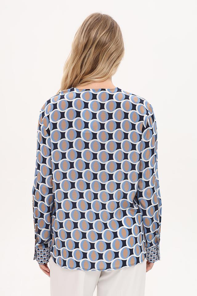 Блуза Frank Walder синего цвета с оригинальным геометрическим принтом. Изготовлена из купро и вискозы, обеспечивающих комфорт и приятные тактильные ощущения. Состав: купро 55%, вискоза 45%