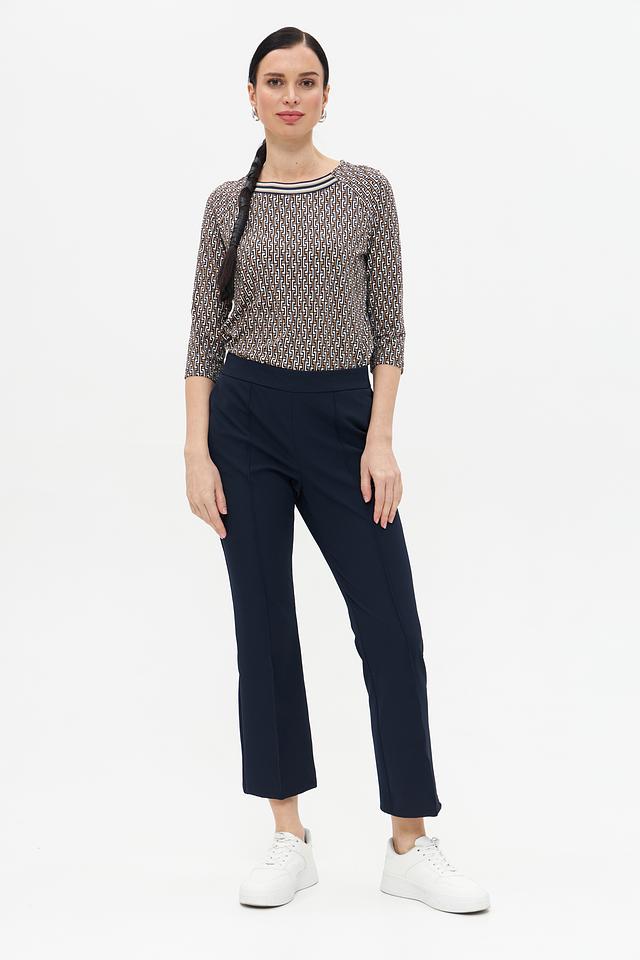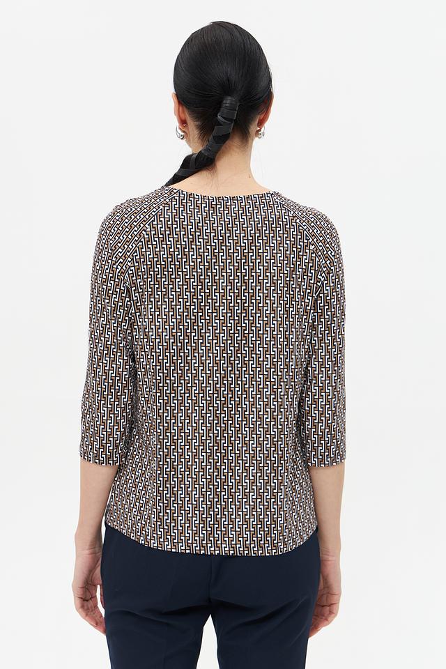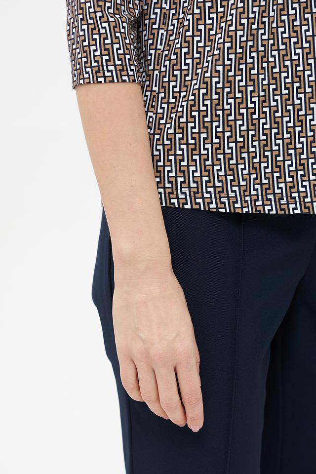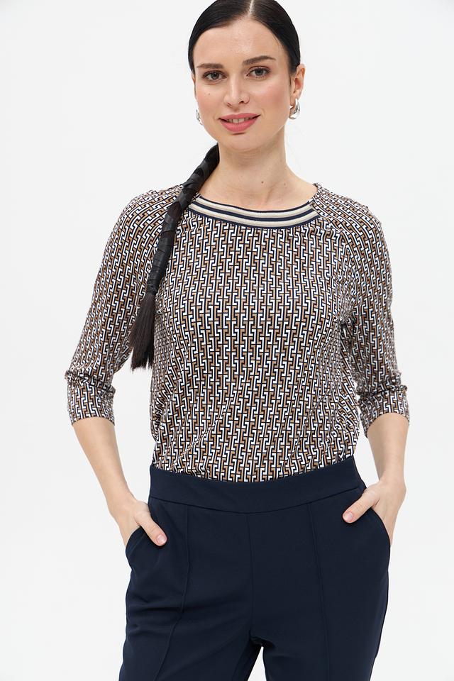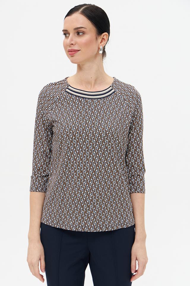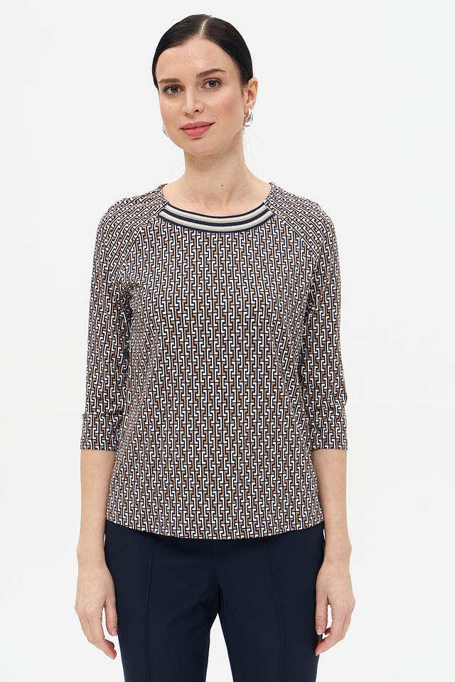 Особенностью данной модели является оригинальный геометрический принт, выполненный в бежевых и коричневых тонах. Футболка имеет круглый вырез горловины и короткий рукав 3/4, что делает ее универсальной для различных образов.