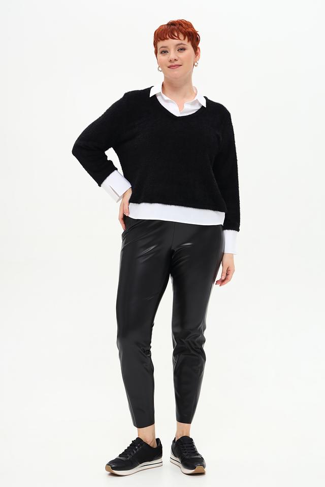 Пуловер имеет V-образный вырез, который визуально удлиняет шею и делает силуэт более изящным. Свободный крой обеспечивает комфорт и свободу движений, а фактурная пряжа придает изделию особый шарм.