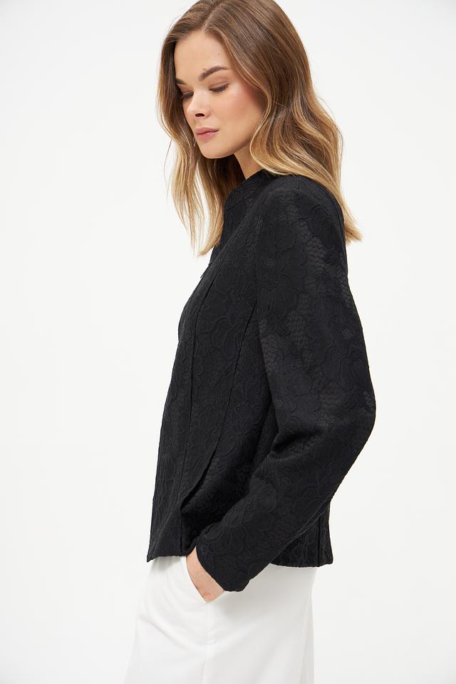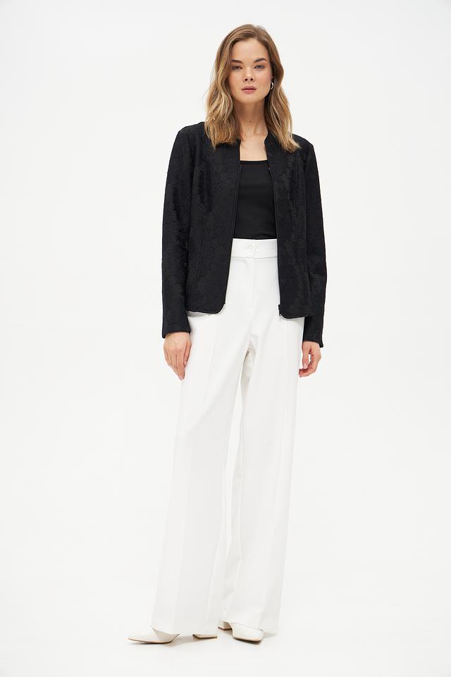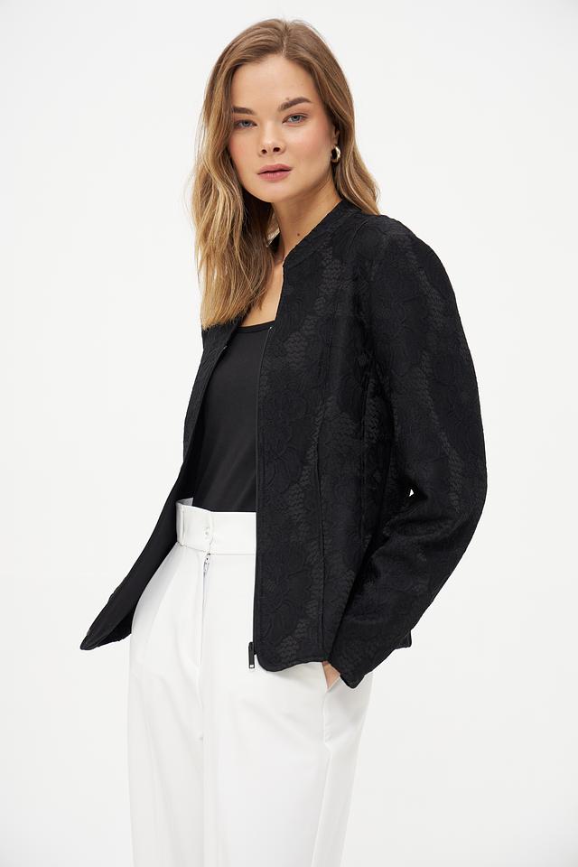 Модель застегивается на молнию, что обеспечивает удобство и практичность. Жакет имеет длинные рукава и воротник-стойку. Состав ткани: 64% полиэстер, 30% полиамид, 6% эластан. Благодаря этому сочетанию материалов, жакет хорошо держит форму, не мнется и приятен к телу.