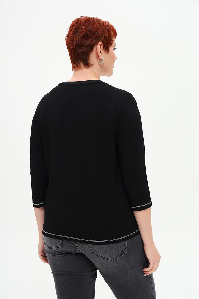 Модель имеет удобный прямой крой, короткие рукава с черной отделкой и круглый вырез горловины, также отделанный черной тесьмой. Контрастные черные рукава добавляют образу динамичности и выразительности.