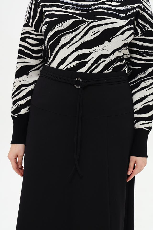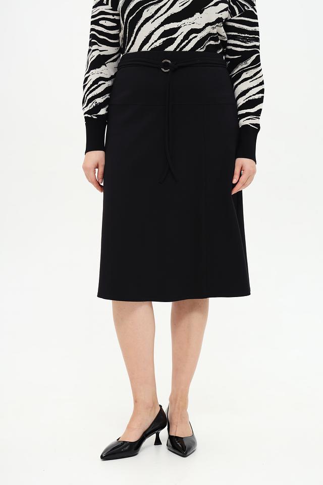Юбка имеет длину миди и прямой крой, что делает её универсальной для создания как повседневных, так и более элегантных образов. Пояс с кулиской позволяет регулировать посадку по фигуре, обеспечивая комфорт и свободу движений.