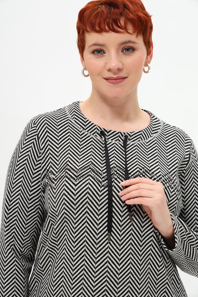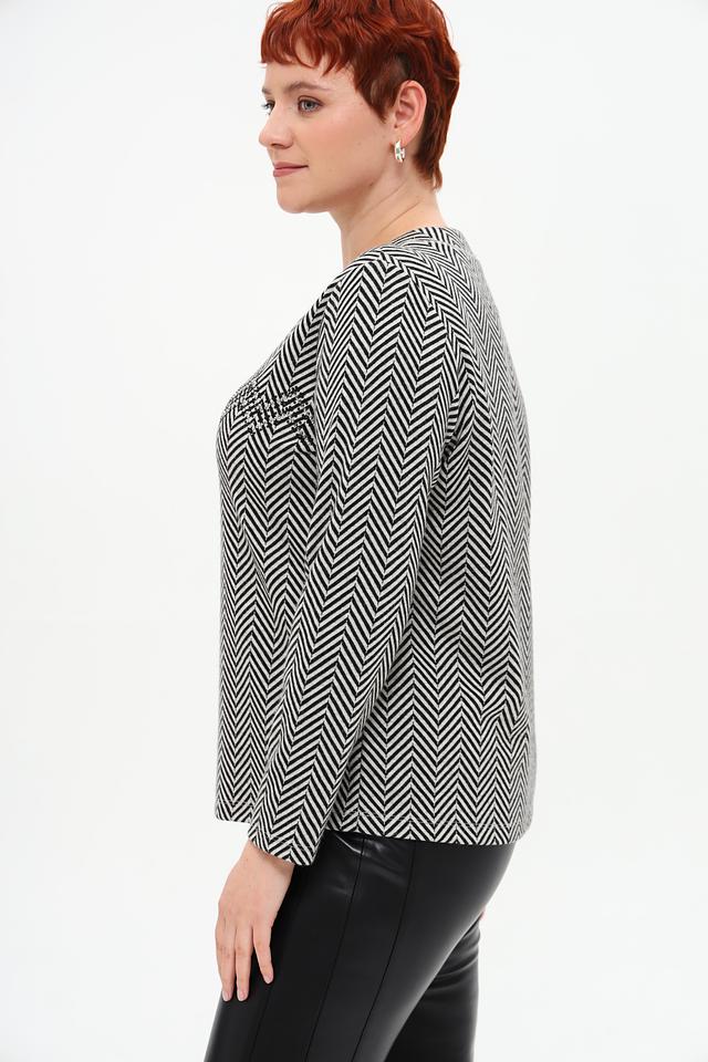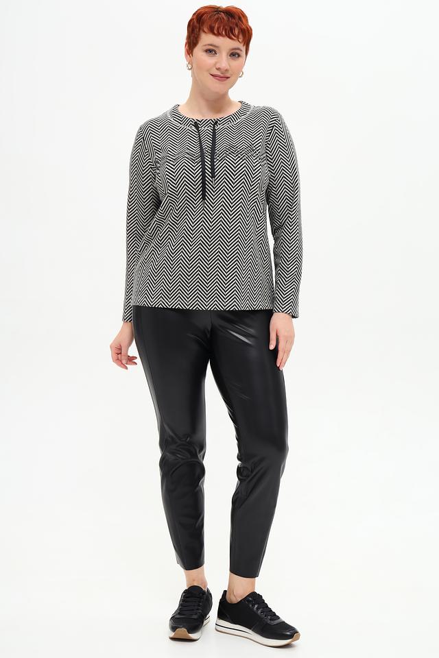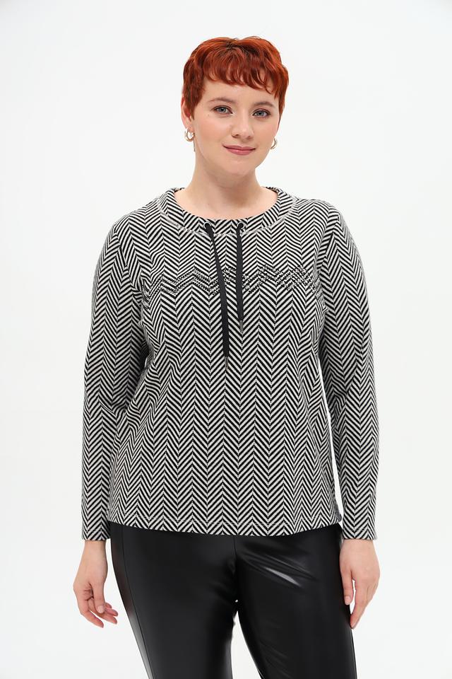 Пуловер имеет классический крой и длинные рукава. Его особенностью является яркий чёрно-белый зигзагообразный принт, который придаёт образу динамичность и оригинальность. Вырез горловины дополнен декоративной кулиской с кисточками, что добавляет модели изысканности.