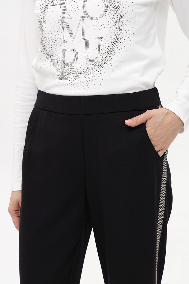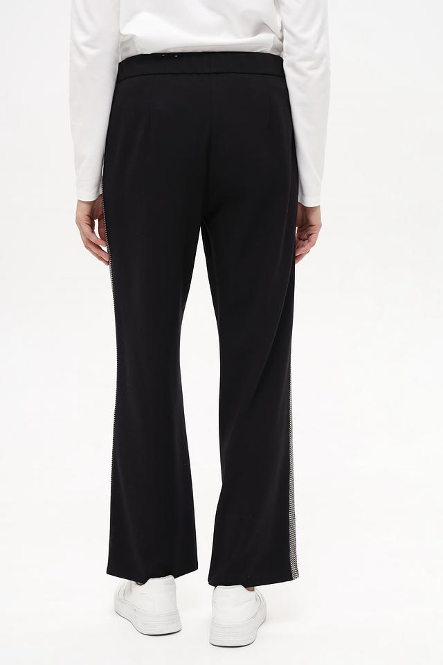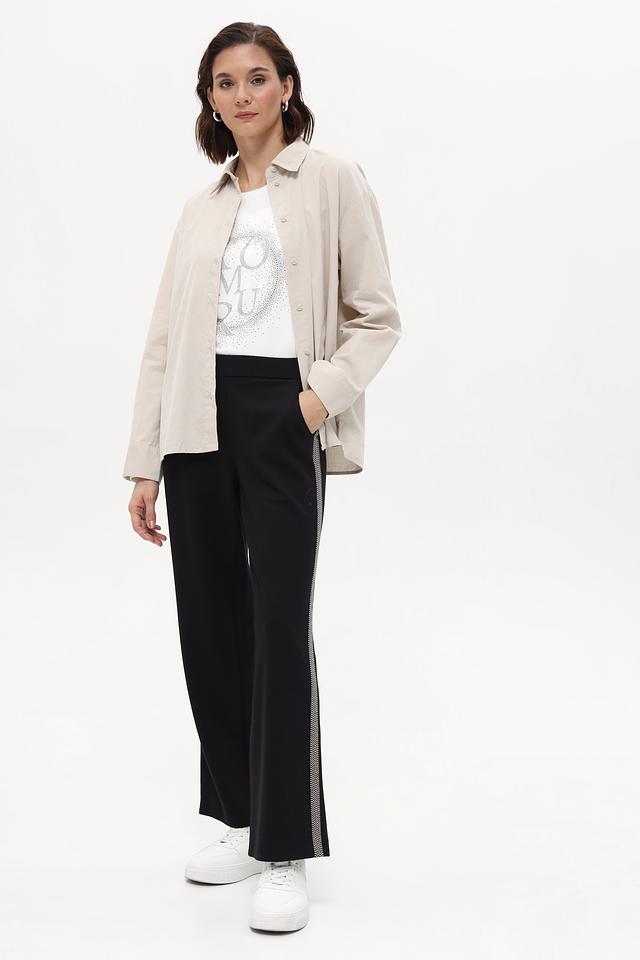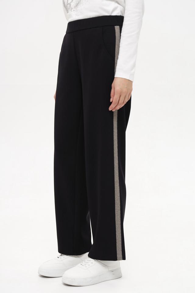 Особенностью модели является декоративная полоса по боковой части штанин, которая придает брюкам стильный и современный вид. Прямой крой и эластичный пояс обеспечивают свободу движений и комфортную посадку по фигуре. Брюки идеально подойдут для создания как повседневных, так и более элегантных образов.