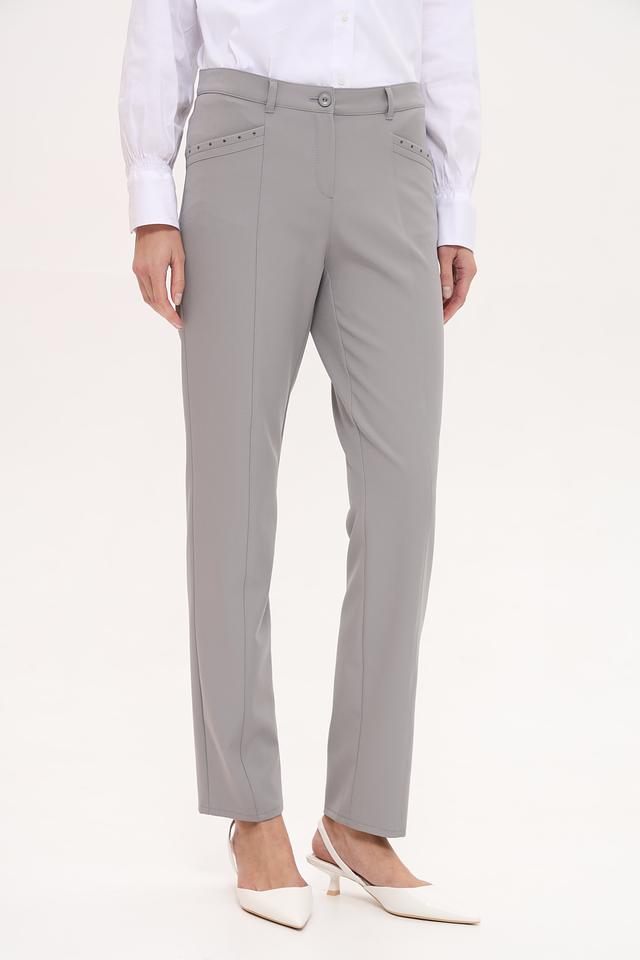 Передние части брюк украшены аккуратными декоративными элементами в виде небольших страз, добавляющих изысканности. Застежка – молния и пуговица. Брюки идеально сочетаются с блузками, рубашками и жакетами, создавая завершенный и стильный образ.