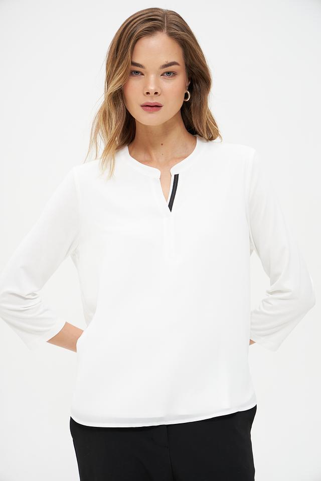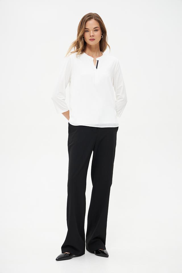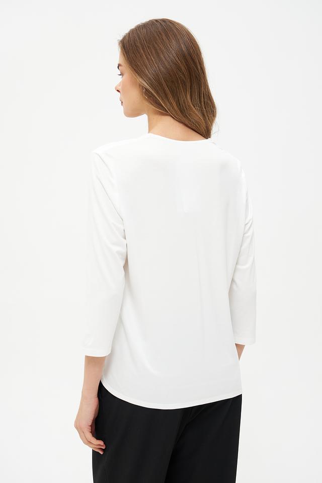 Модель имеет V-образный вырез горловины, который визуально удлиняет шею и придает образу женственности. Рукава длиной 3/4 делают блузку универсальной и подходящей для любого времени года.