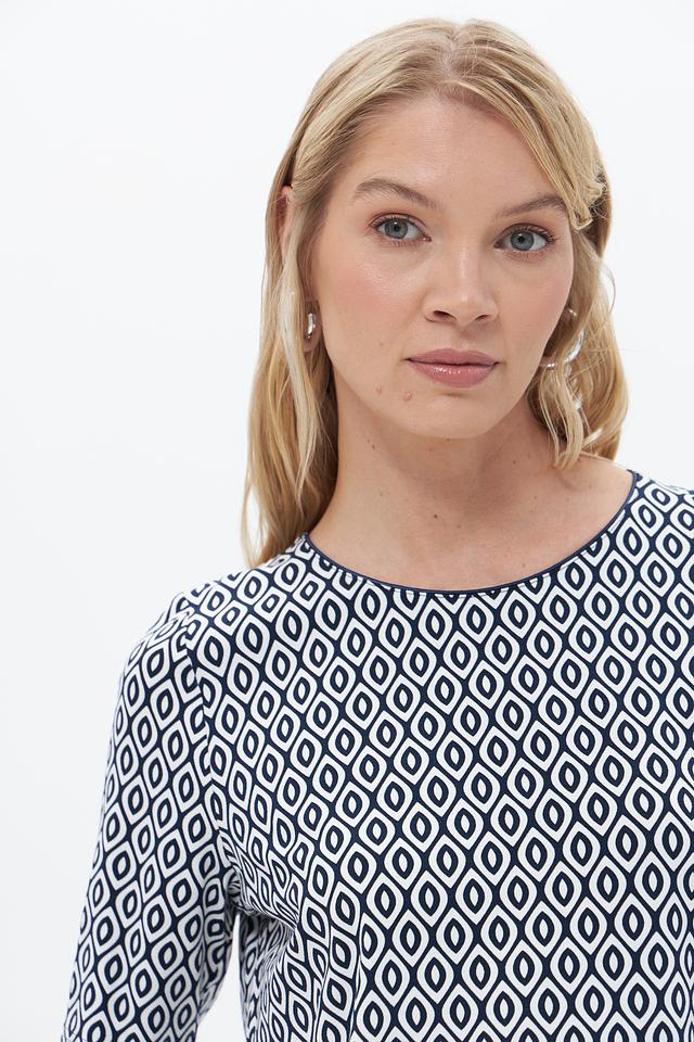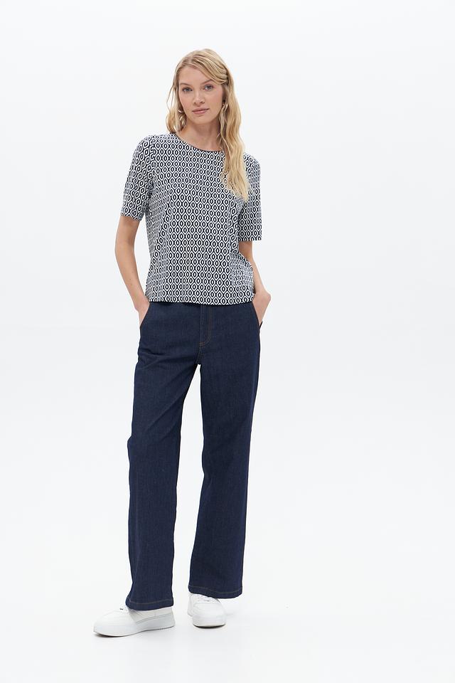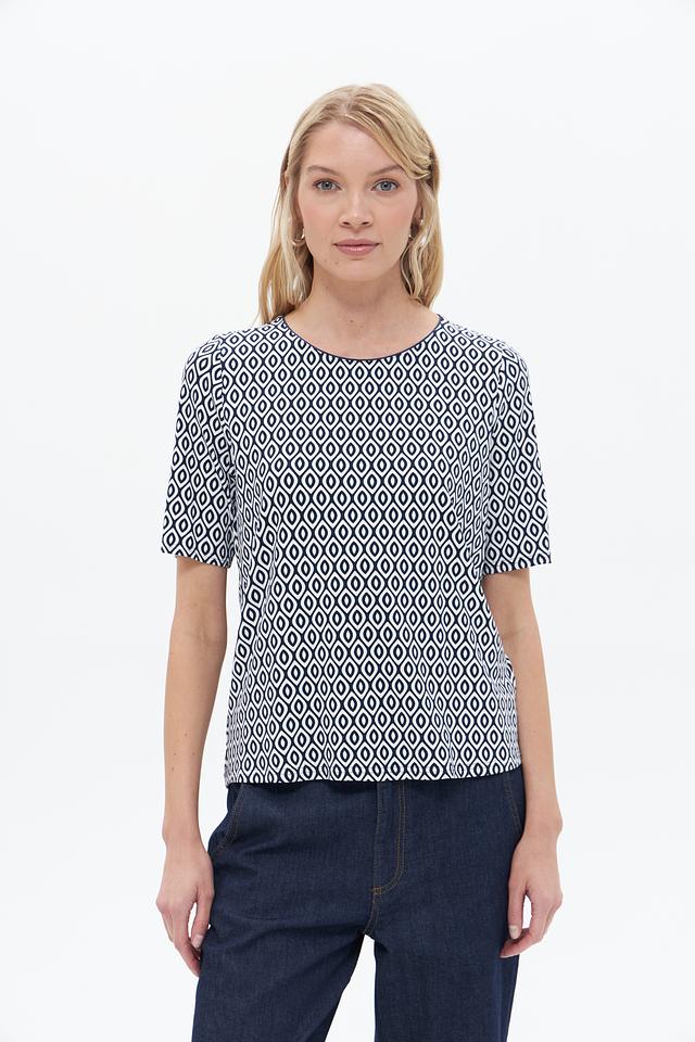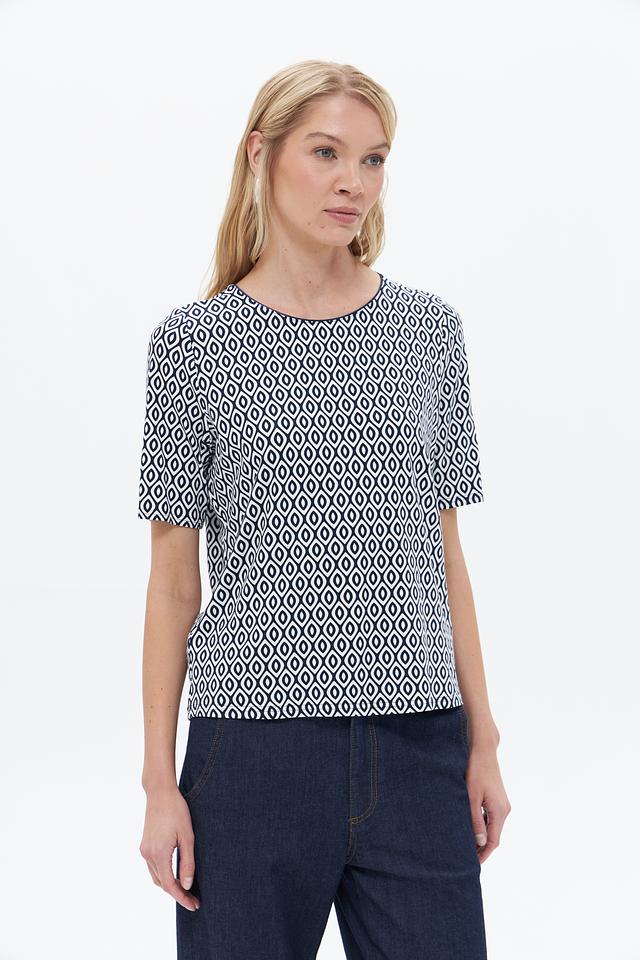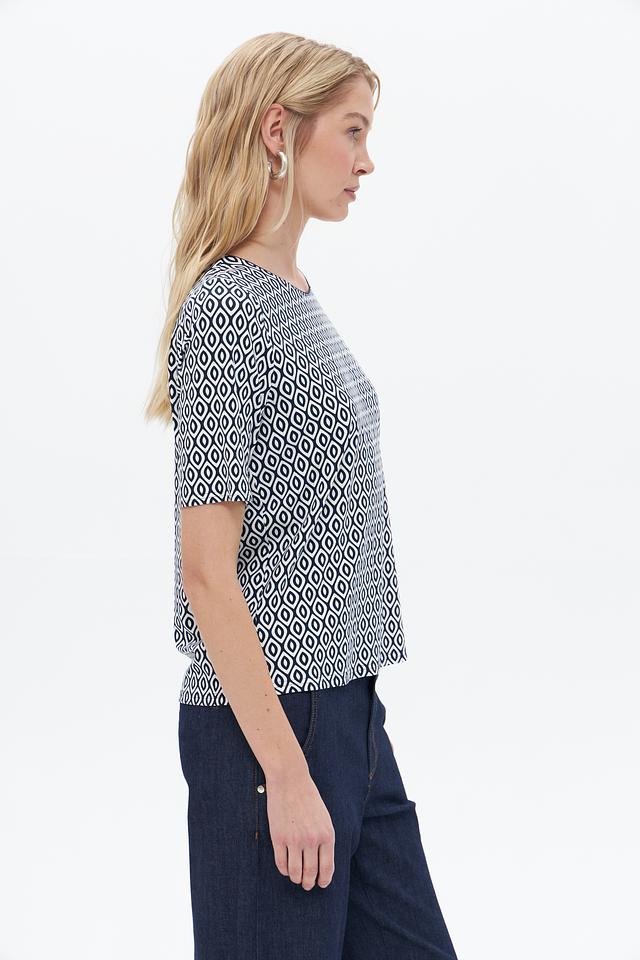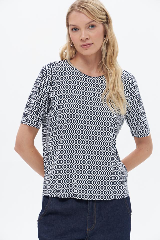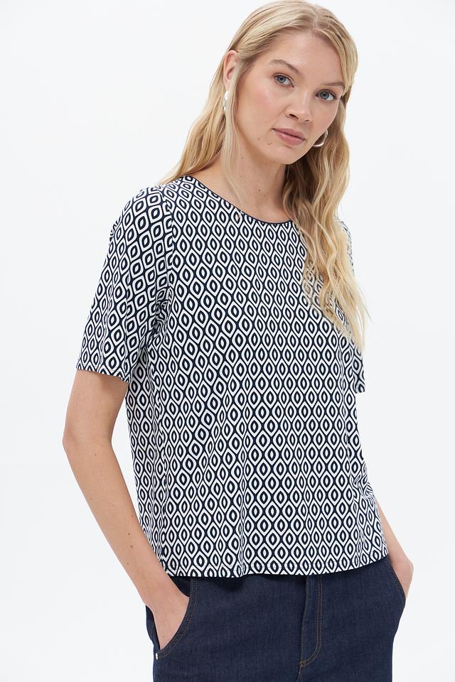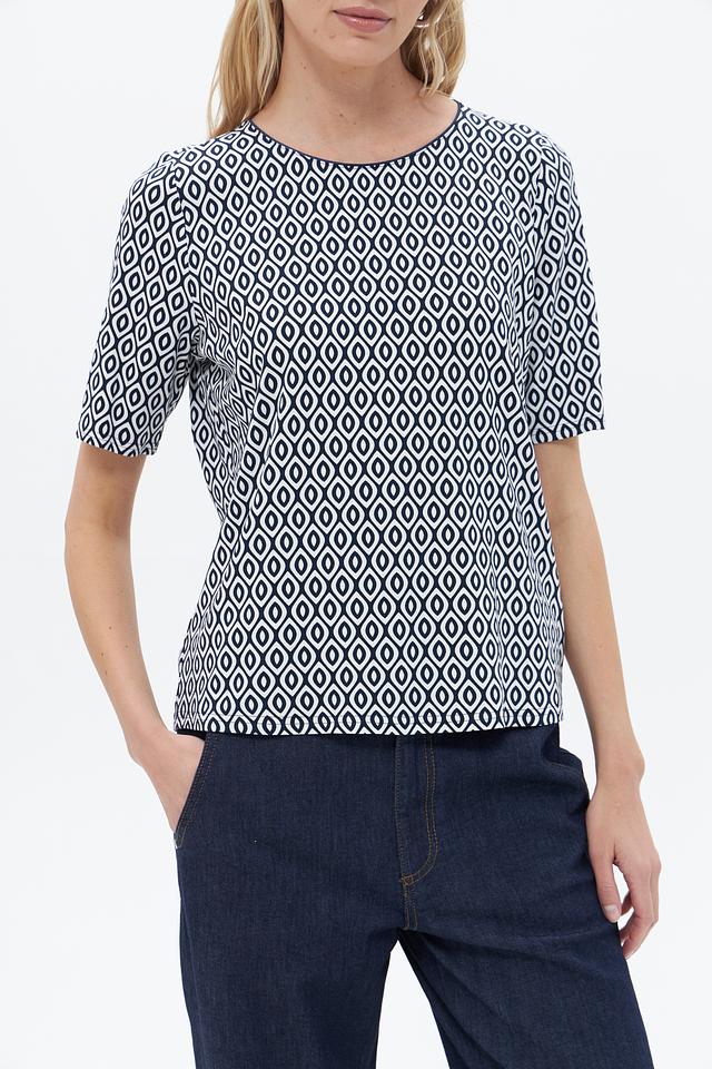 Основной цвет футболки – белый, украшен контрастным чёрным геометрическим принтом. Круглый вырез горловины и короткие рукава делают эту модель универсальной и подходящей для различных образов.