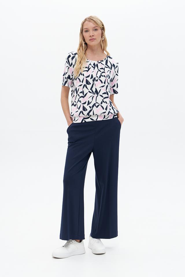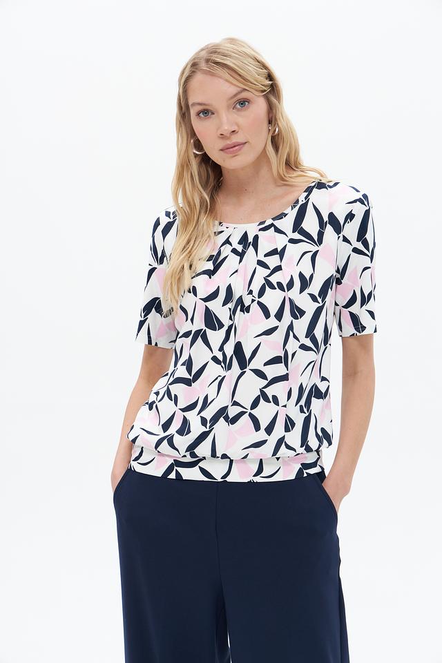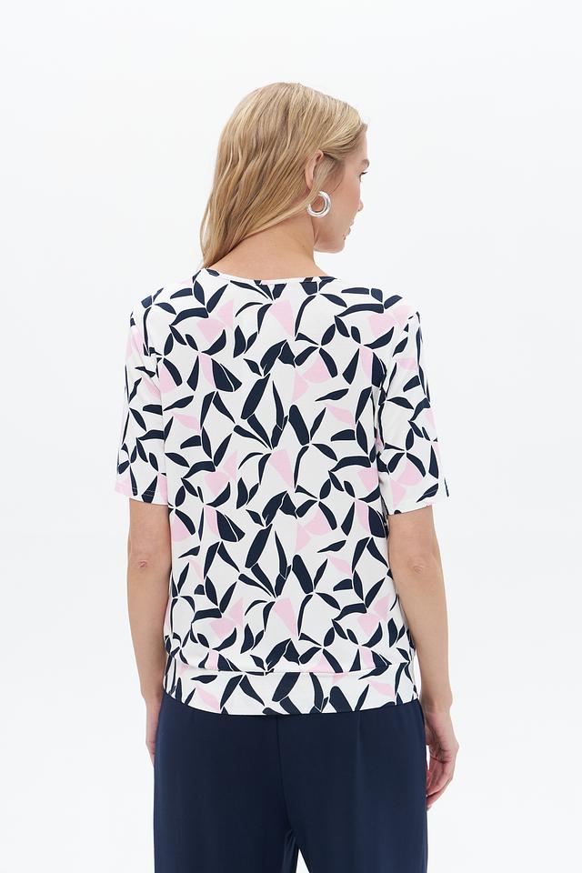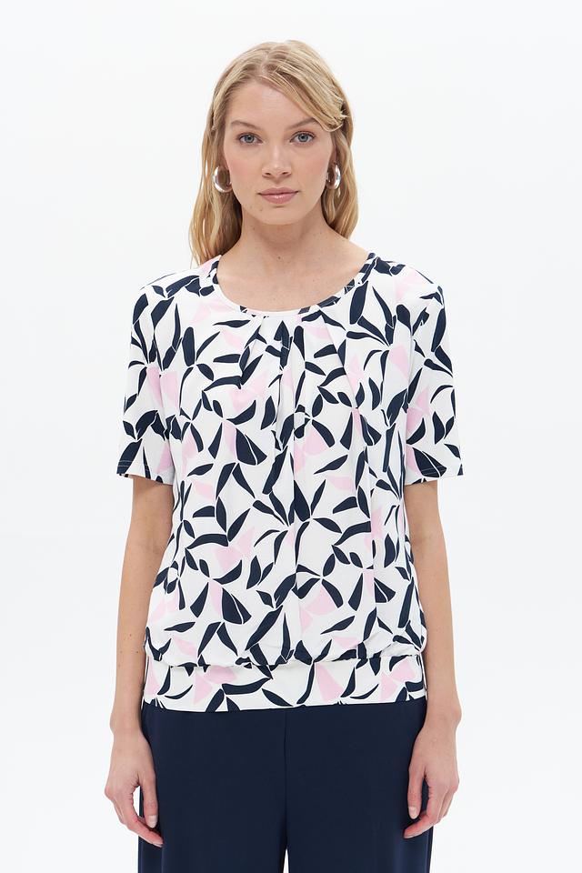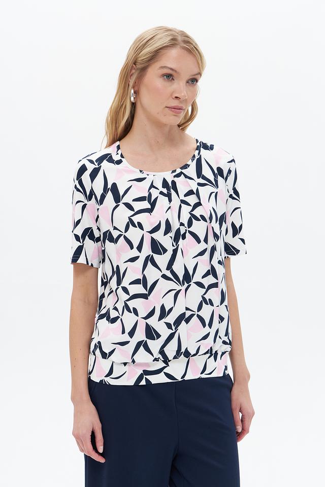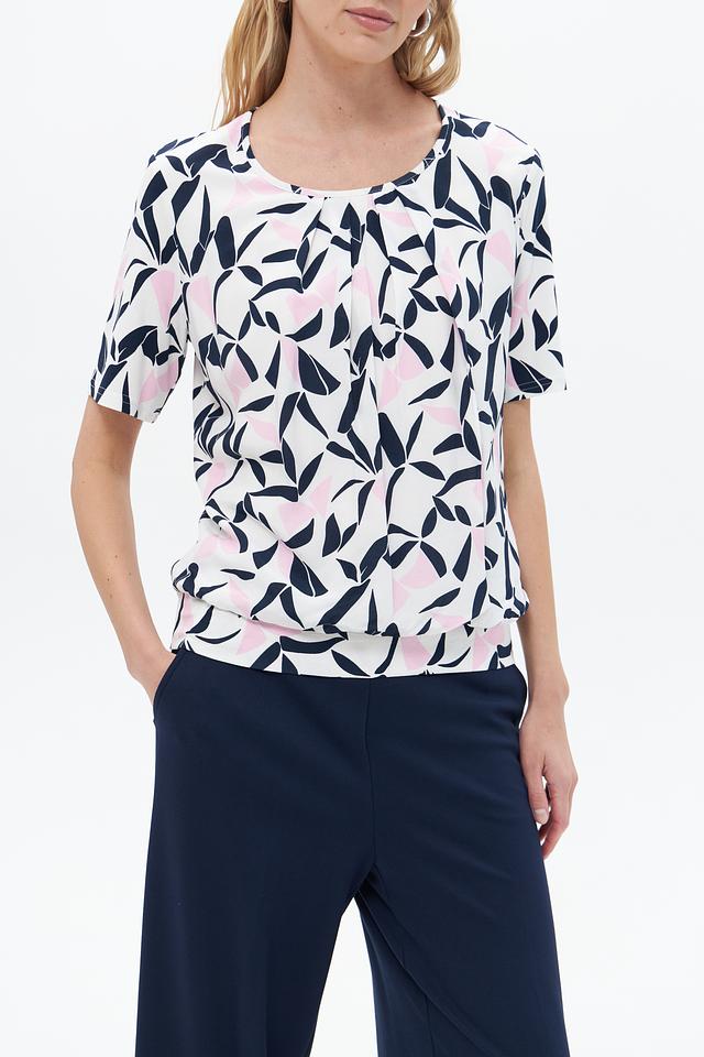 Блуза имеет свободный крой и короткие рукава, что делает её идеальной для тёплой погоды. Основной цвет блузы – белый, а ярким акцентом является оригинальный цветочный принт, выполненный в нежных розовых и тёмно-синих тонах.
