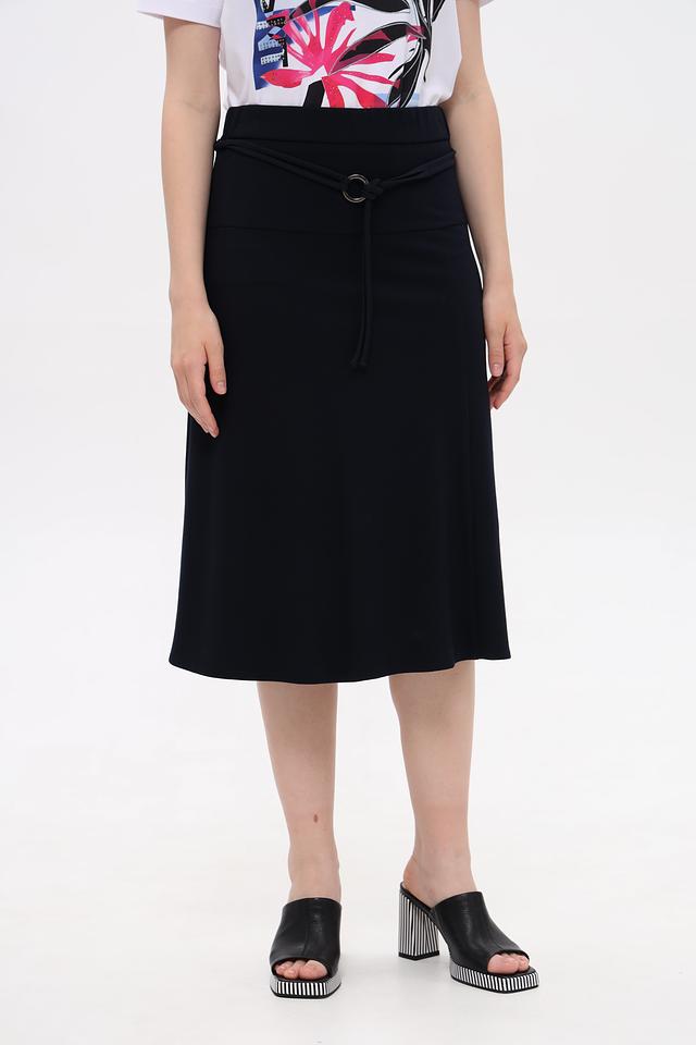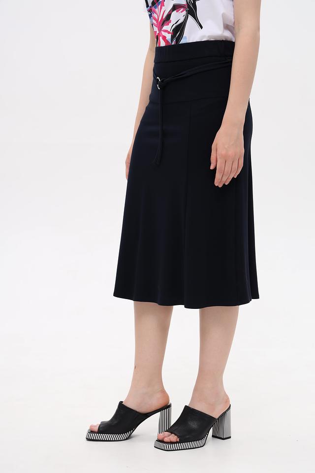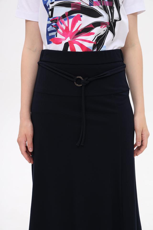 Тёмно-синяя юбка Frank Walder миди длины с поясом и завязками. Изготовлена из модала, полиэстера и эластана, обеспечивающих комфорт и хорошую посадку. Идеально подходит для создания стильных повседневных образов. Состав: модал 55%, полиэстер 39%, эластан 6%
