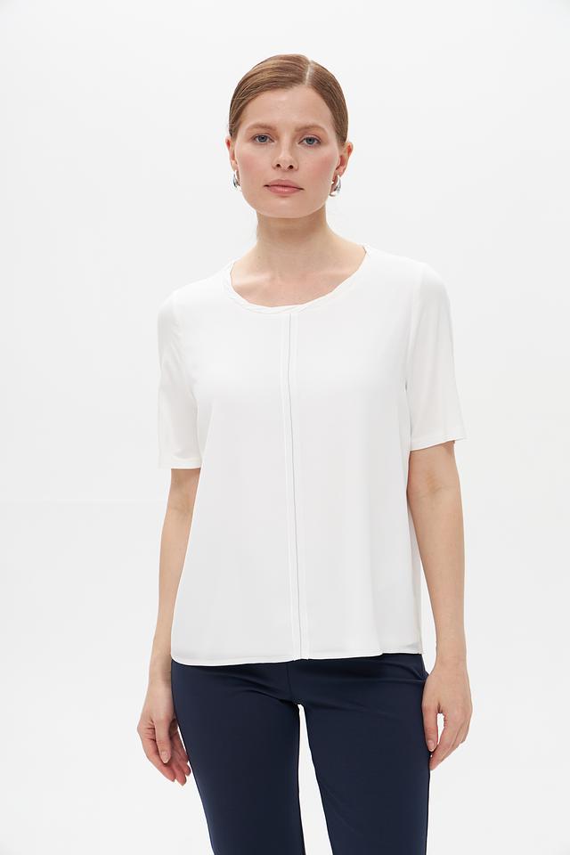 Модель имеет прямой, слегка свободный крой, который не сковывает движений и хорошо скрывает недостатки фигуры. Круглый вырез горловины и короткие рукава делают блузку идеальной для теплой погоды. Декоративные вертикальные разрезы по центру переда придают изделию изысканность и оригинальность.
