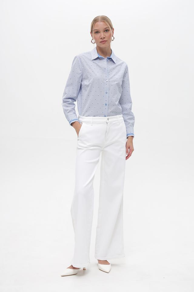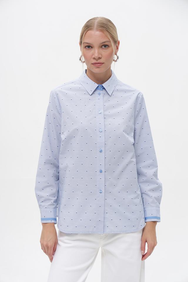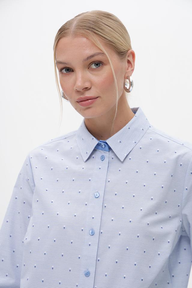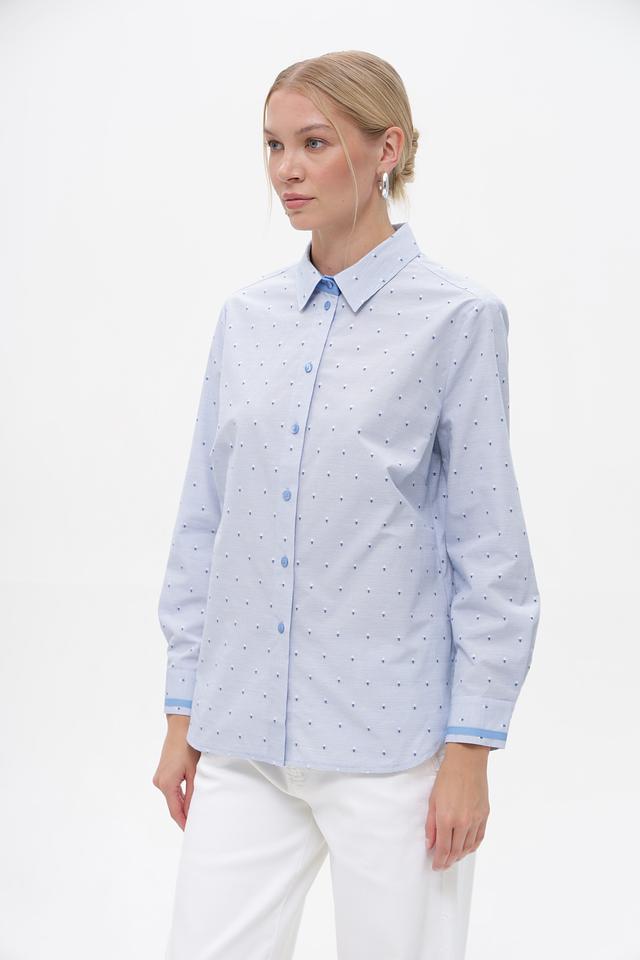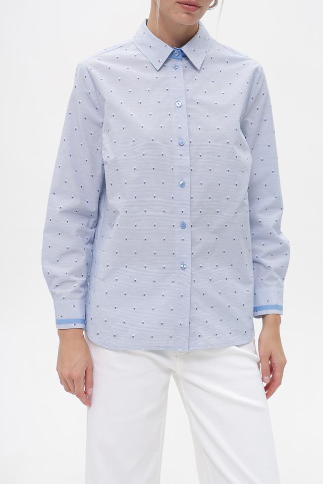 Женская блузка Frank Walder голубого цвета с принтом в полоску и мелкий горошек. Изготовлена из хлопка с добавлением полиэстера для комфорта и практичности. Состав: хлопок 63%, полиэстер 37%