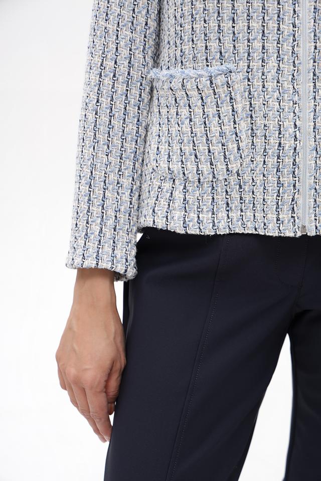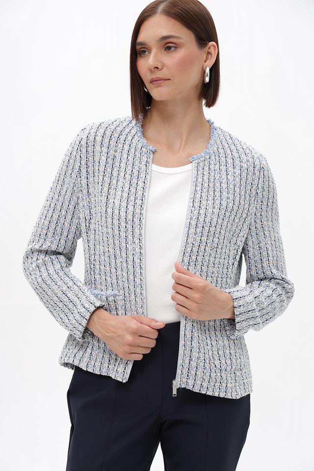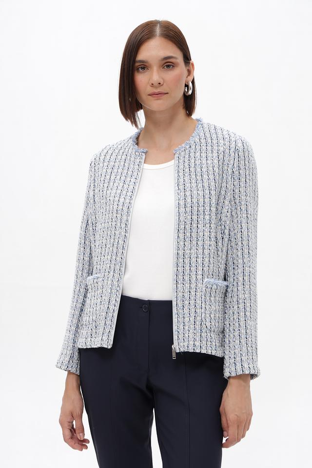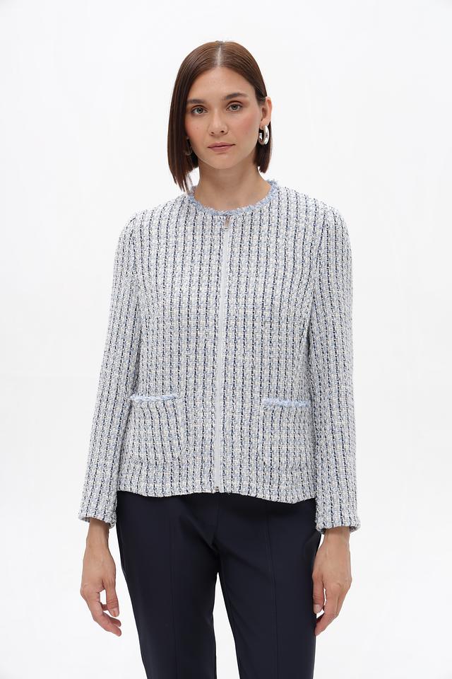 Голубой жакет Frank Walder из смесового твида. Модель на молнии с отделкой бахромой по краю. Состав включает хлопок, полиэстер и эластан для комфорта и износостойкости. Состав: хлопок 66%, полиэстер 28%, эластан 4%, вискоза 2%