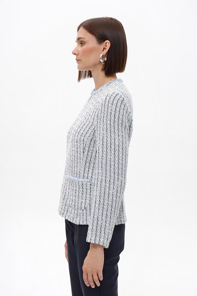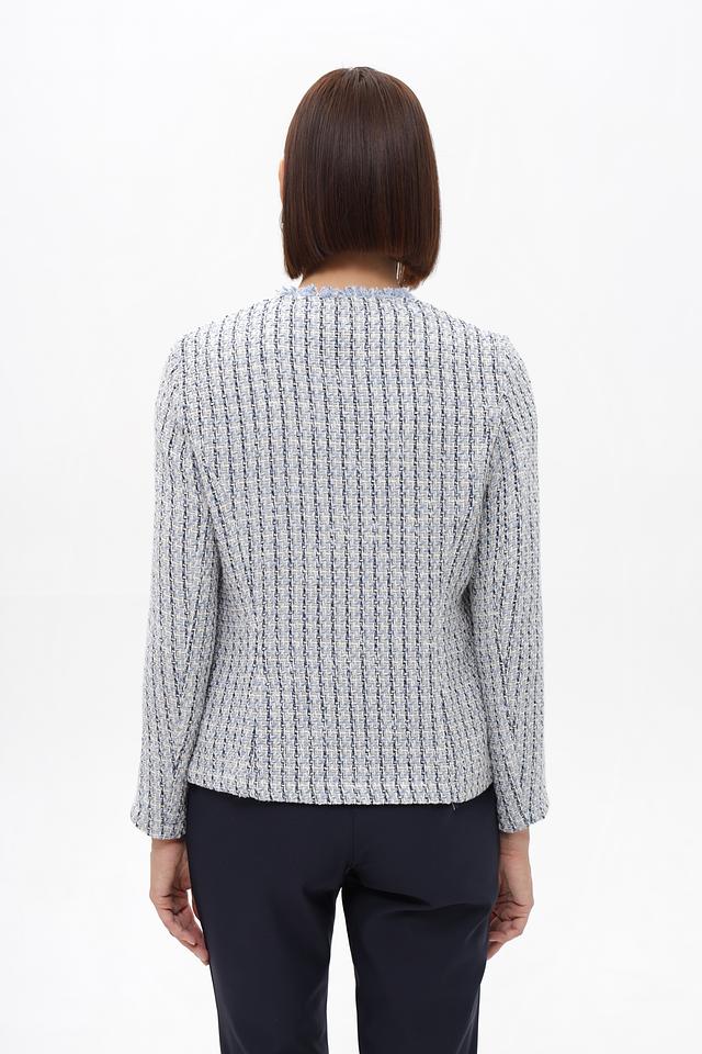 Жакет Frank Walder выполнен из фактурного твида голубого оттенка с включением белых и серых нитей. Модель имеет приталенный силуэт и длину до линии бедер.