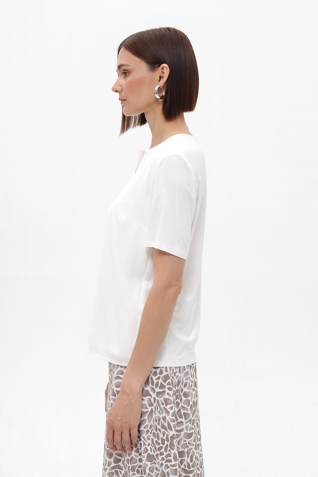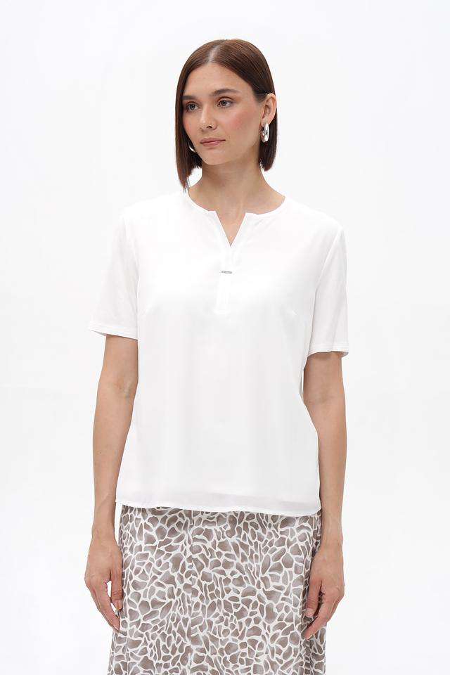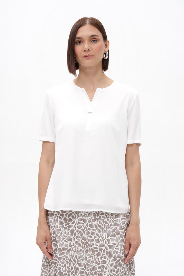 Блузка имеет прямой, слегка свободный крой, который обеспечивает комфортную посадку по фигуре. V-образный вырез деликатно подчеркивает зону декольте, а короткие рукава делают ее идеальным вариантом для теплой погоды.