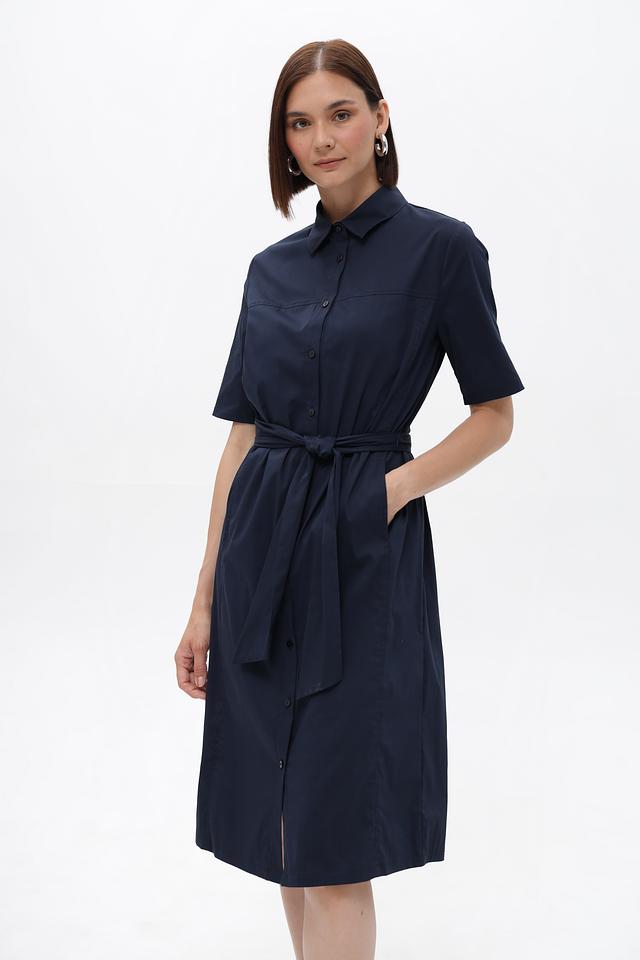 Платье имеет приталенный силуэт, который подчеркивает достоинства фигуры. Застежка на пуговицы по всей длине и воротник рубашка придают изделию лаконичный и сдержанный вид. Короткие рукава делают платье идеальным выбором для теплой погоды.