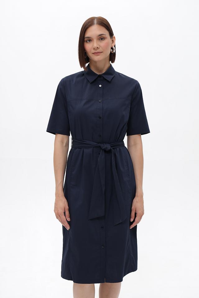 Изделие дополнено поясом в тон, который позволяет выделить талию и создать более женственный силуэт. На передней части платья расположены функциональные боковые карманы. Состав ткани: хлопок 76%, полиамид 22%, эластан 2%.