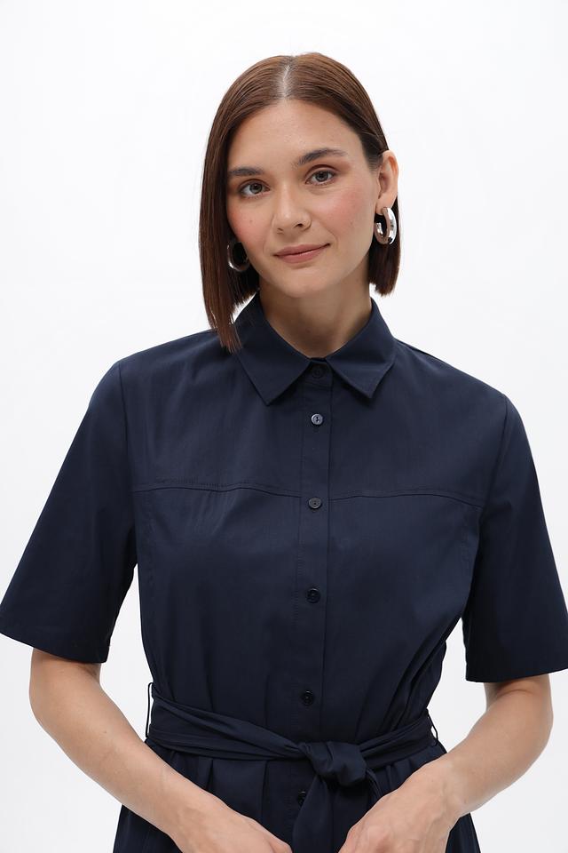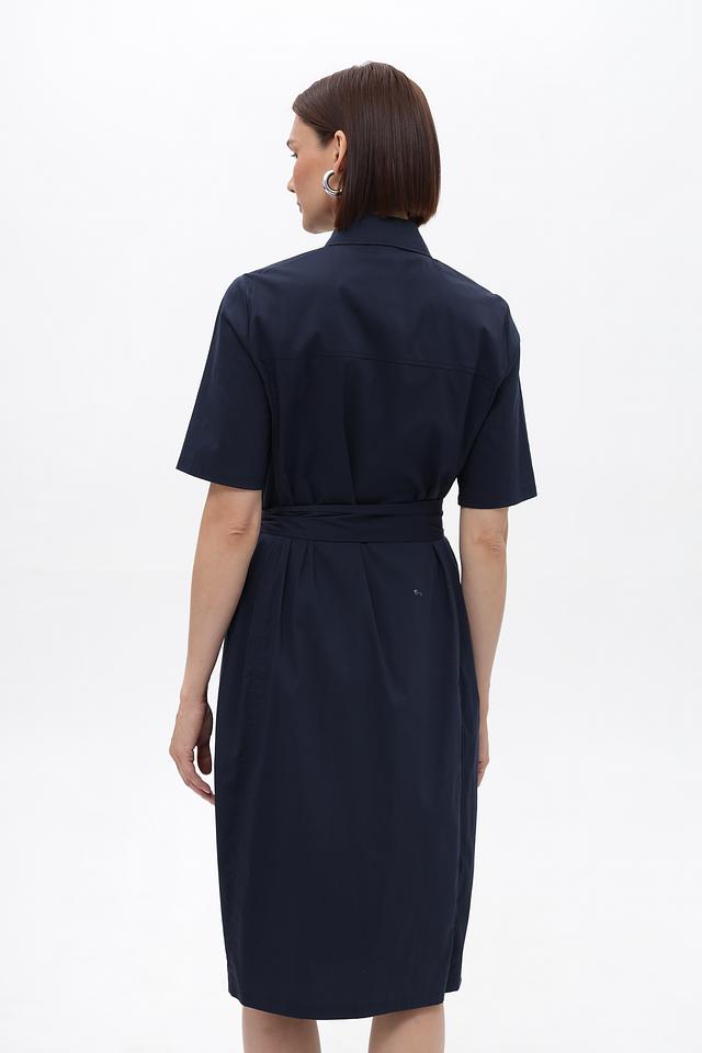 Темно-синее платье рубашка от Frank Walder выполнено из хлопка с добавлением полиамида и эластана. Модель с короткими рукавами, воротником и застежкой на пуговицы, подчеркнута приталенным силуэтом и поясом. Состав: хлопок 76%, полиамид 22%, эластан 2%