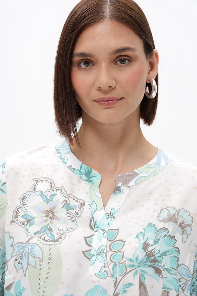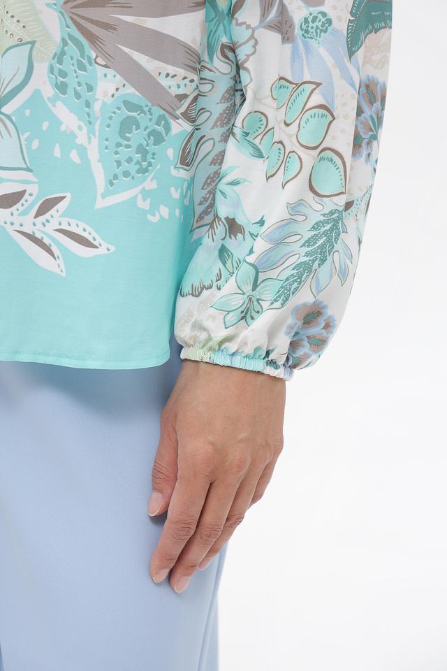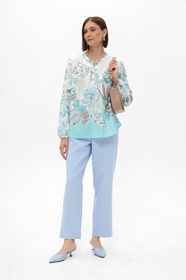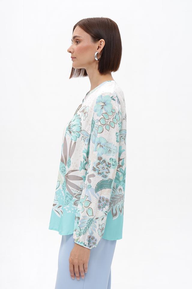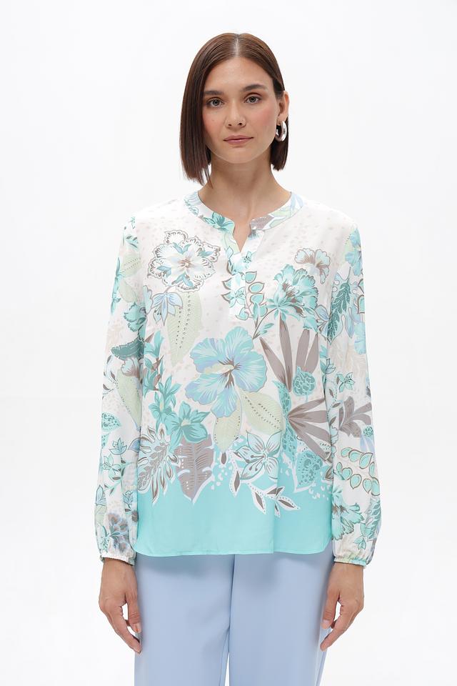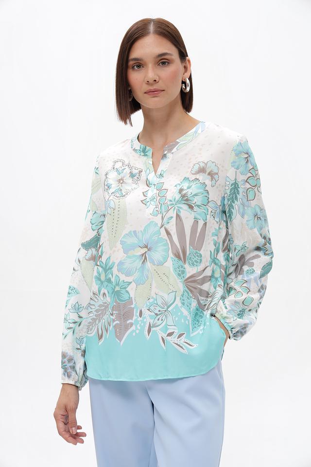 Основной цвет блузки – светло-голубой, который гармонично сочетается с ярким цветочным принтом, выполненным в оттенках голубого, зеленого и бежевого. Принт покрывает большую часть блузки, создавая эффектный и запоминающийся образ.