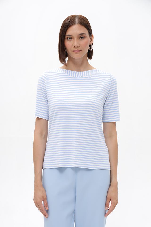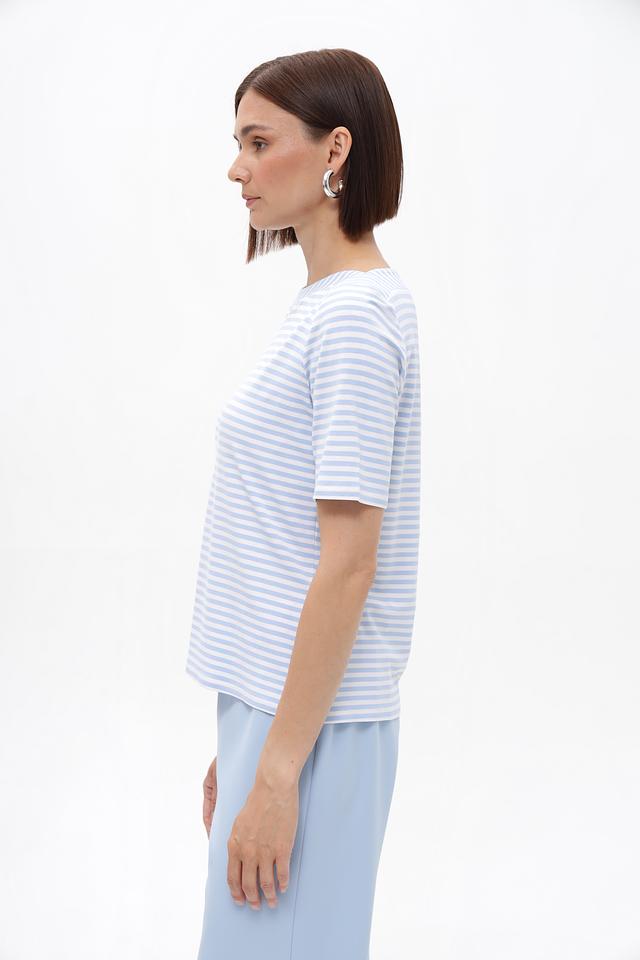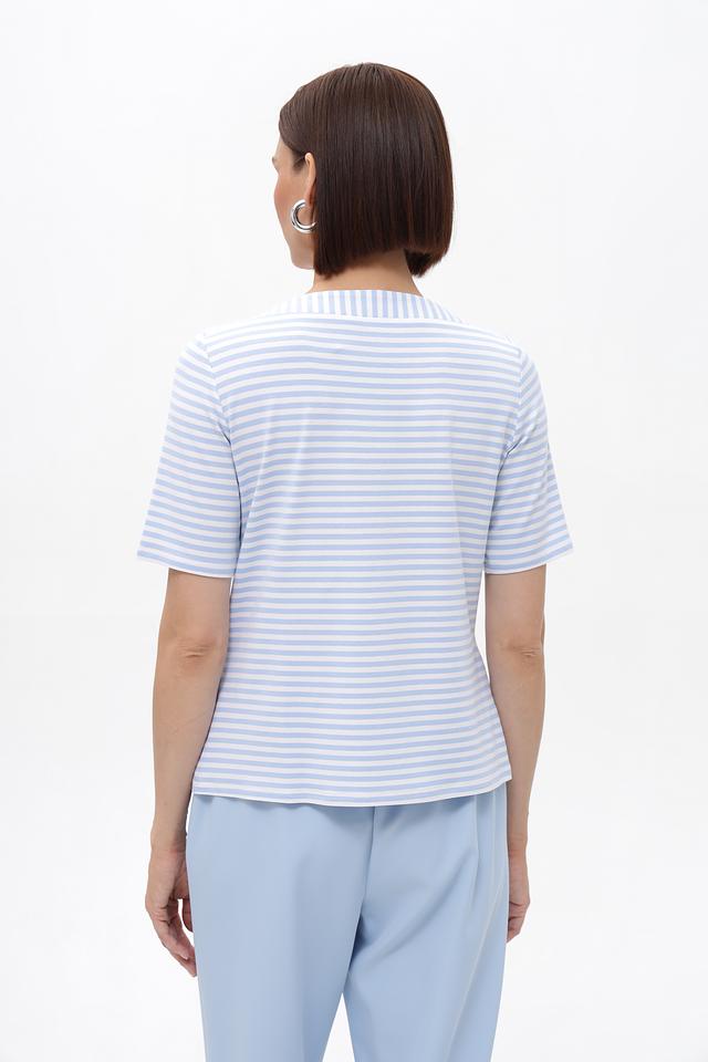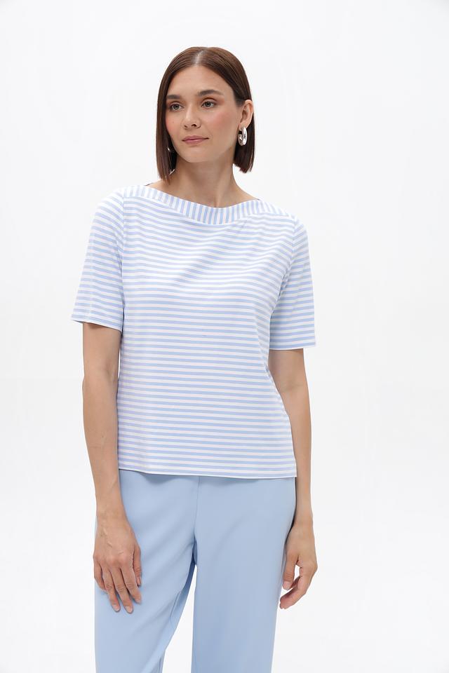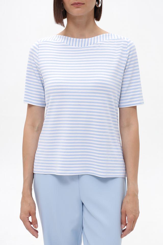 Женская футболка Frank Walder голубого цвета в классическую полоску. Модель выполнена из мягкой вискозы с добавлением эластана, что обеспечивает комфорт и отличную посадку по фигуре. Идеальный выбор для создания повседневных образов. Состав: вискоза 96%, эластан 4%