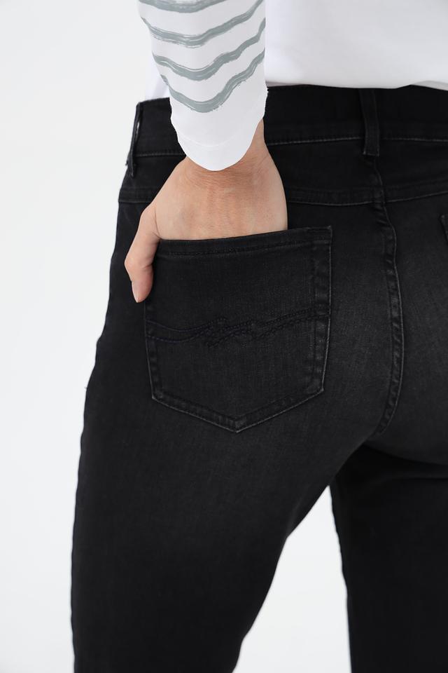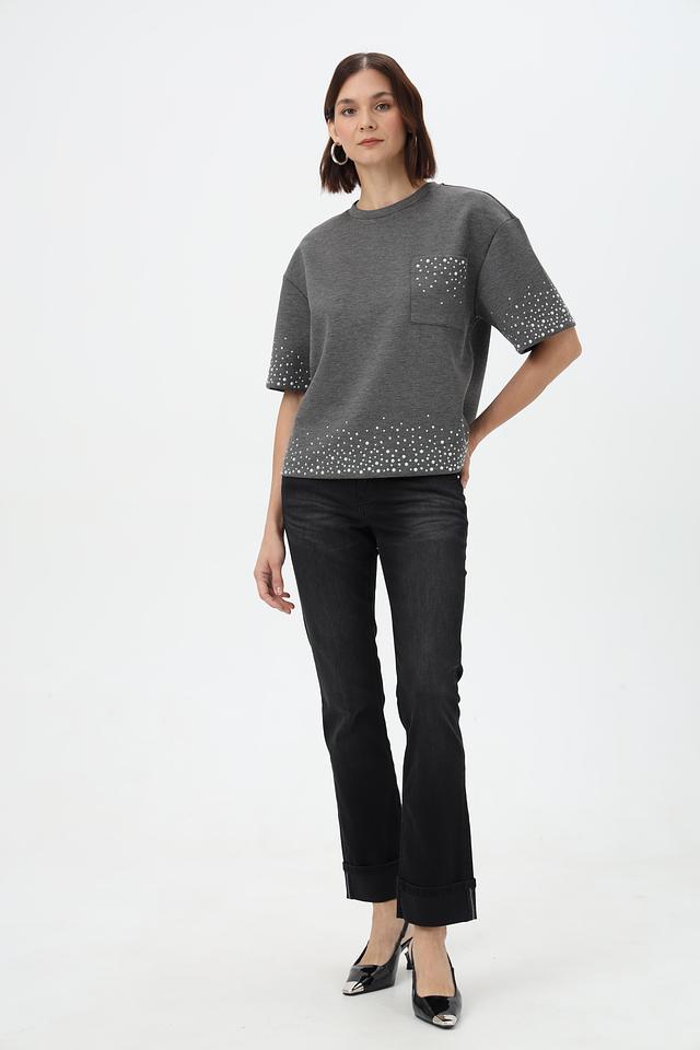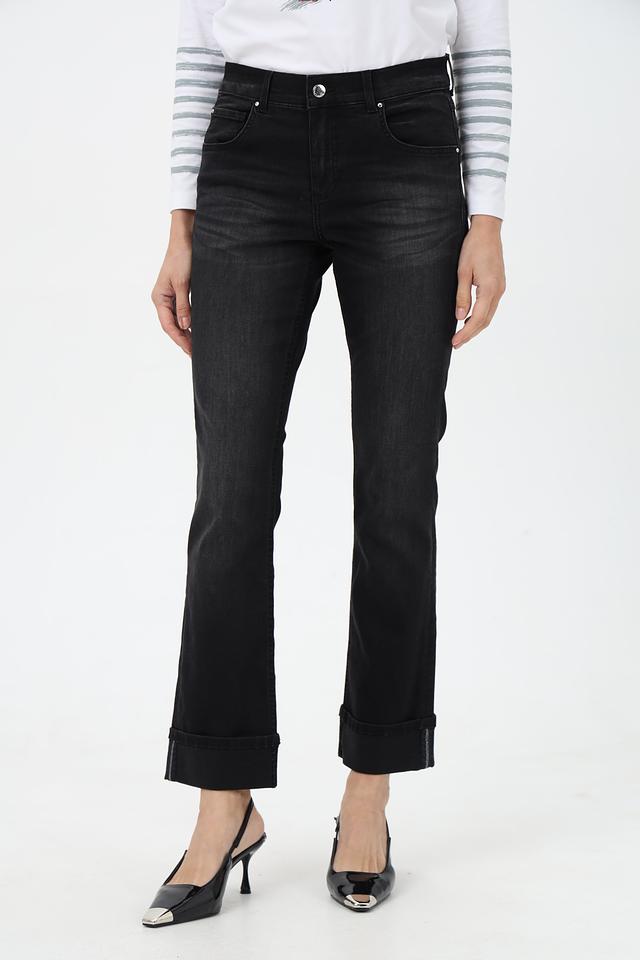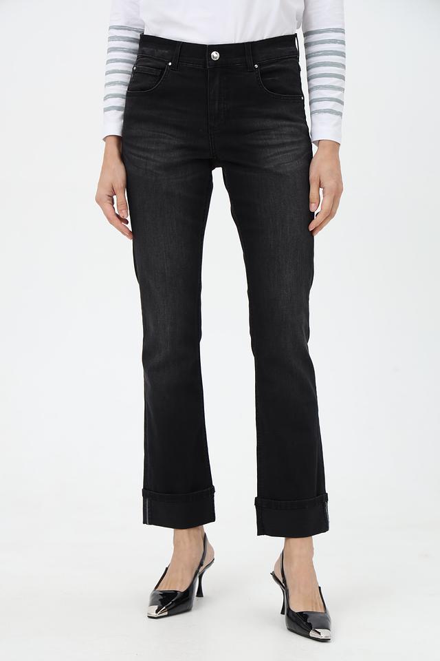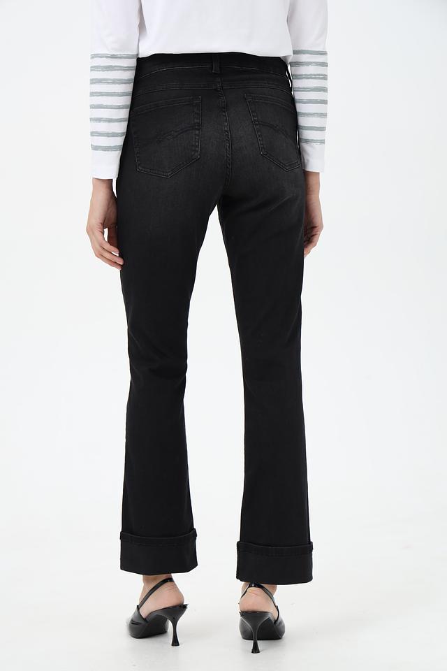 Джинсы имеют классическую посадку и пять карманов, что делает их практичными и универсальными. Отличительной особенностью является наличие подворотов на штанинах, придающих образу непринужденность.