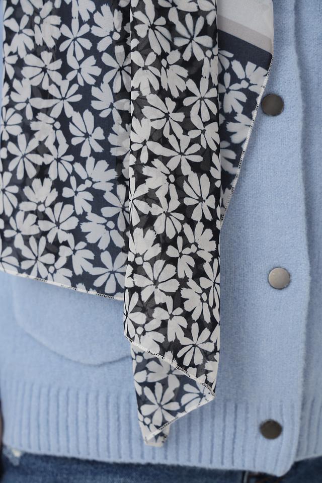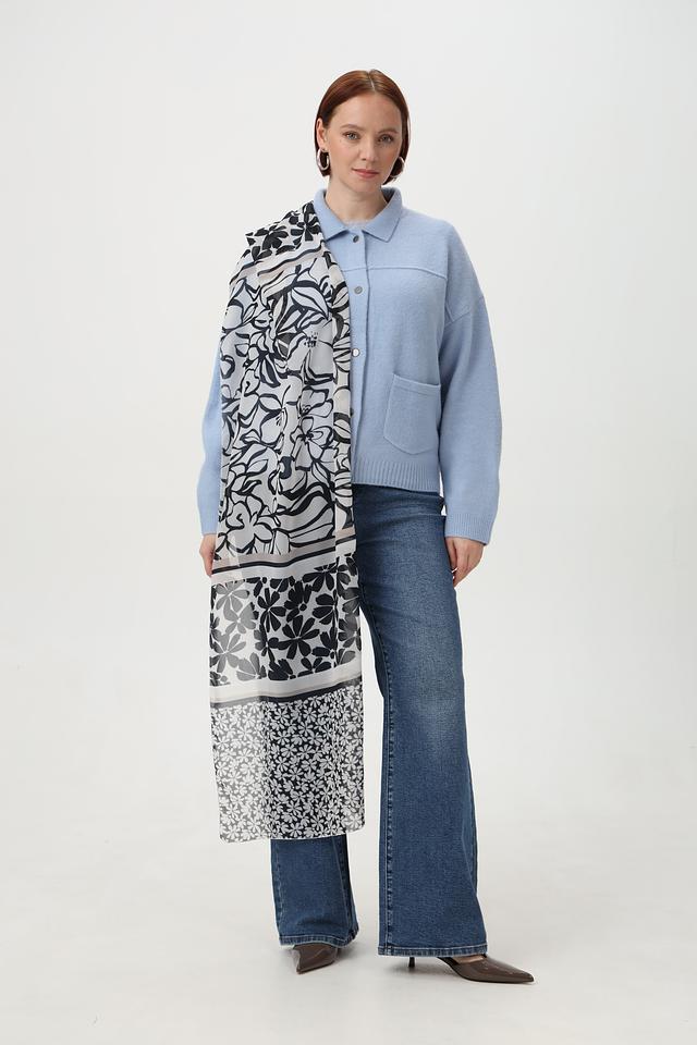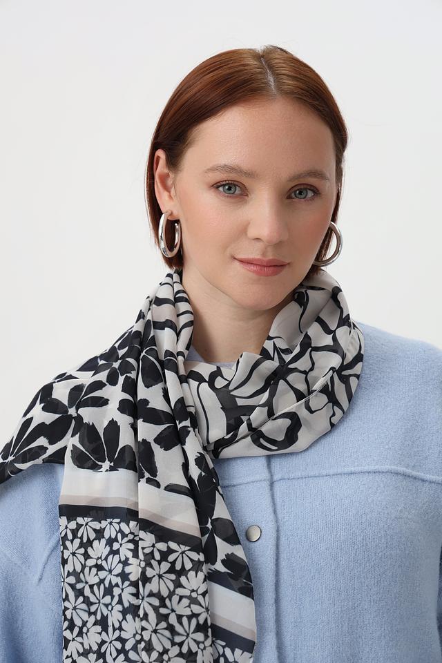 Шарф украшен оригинальным цветочным принтом в чёрно-белой гамме. Этот принт делает аксессуар универсальным и подходящим для различных стилей одежды – от классики до casual.