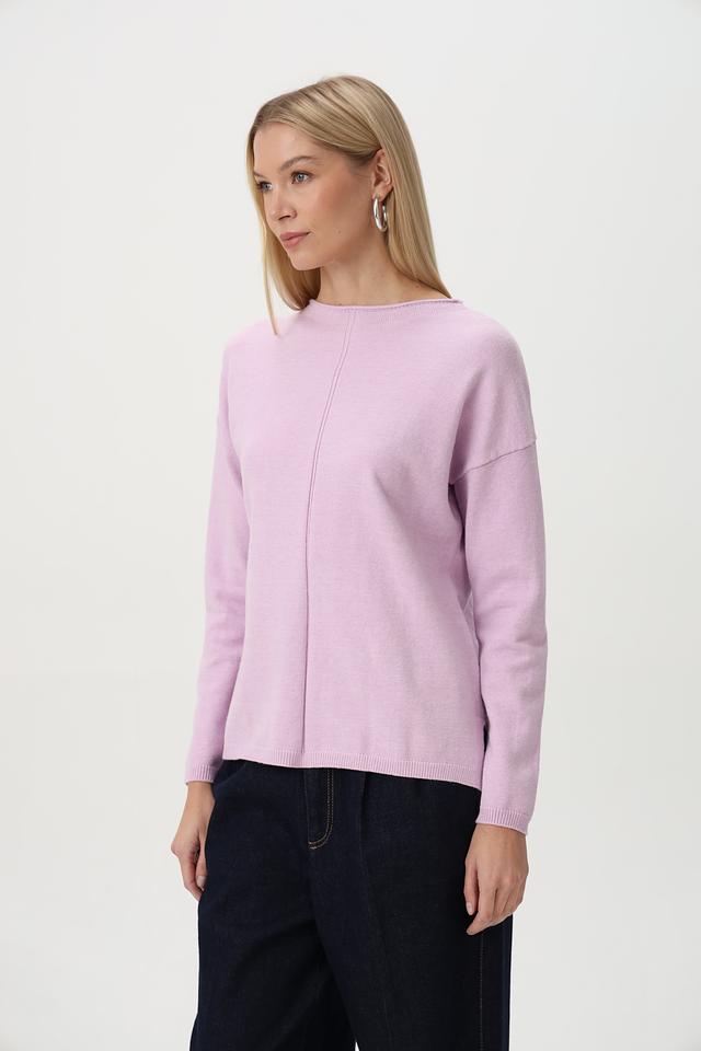 Пуловер имеет классический округлый вырез горловины и длинные рукава с манжетами. Передняя часть изделия украшена вертикальной вытачкой, которая визуально вытягивает силуэт и добавляет изысканности. Текстура трикотажа придает изделию мягкость и уют.