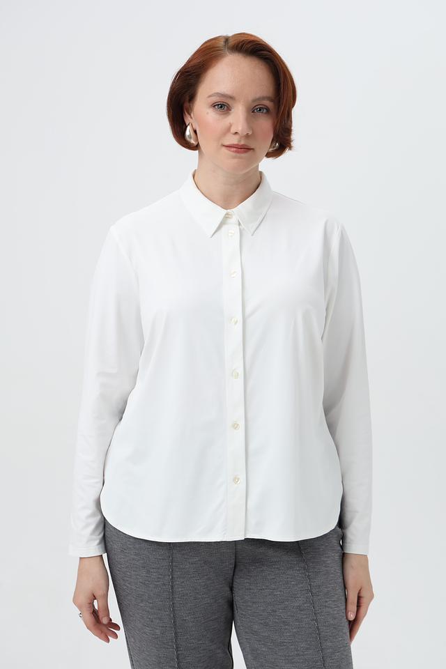 Модель имеет прямой крой, который обеспечивает комфортную посадку по фигуре. Воротник рубашечного типа придает блузке деловой вид. Застежка на пуговицы по всей длине.