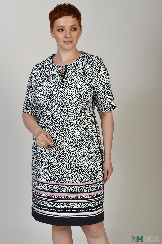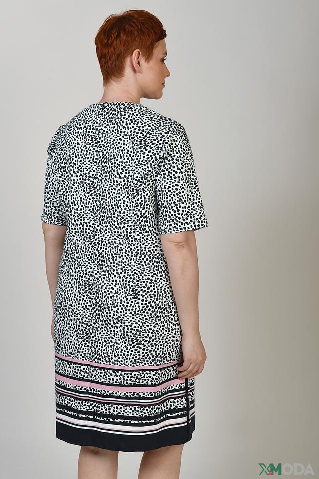 Основной цвет платья – белый, он служит прекрасным фоном для яркого принта в виде мелких тёмно-синих пятен, напоминающих леопардовый окрас. Нижняя часть платья украшена горизонтальными полосками в чёрно-розовой гамме, что добавляет образу динамичности и оригинальности.
