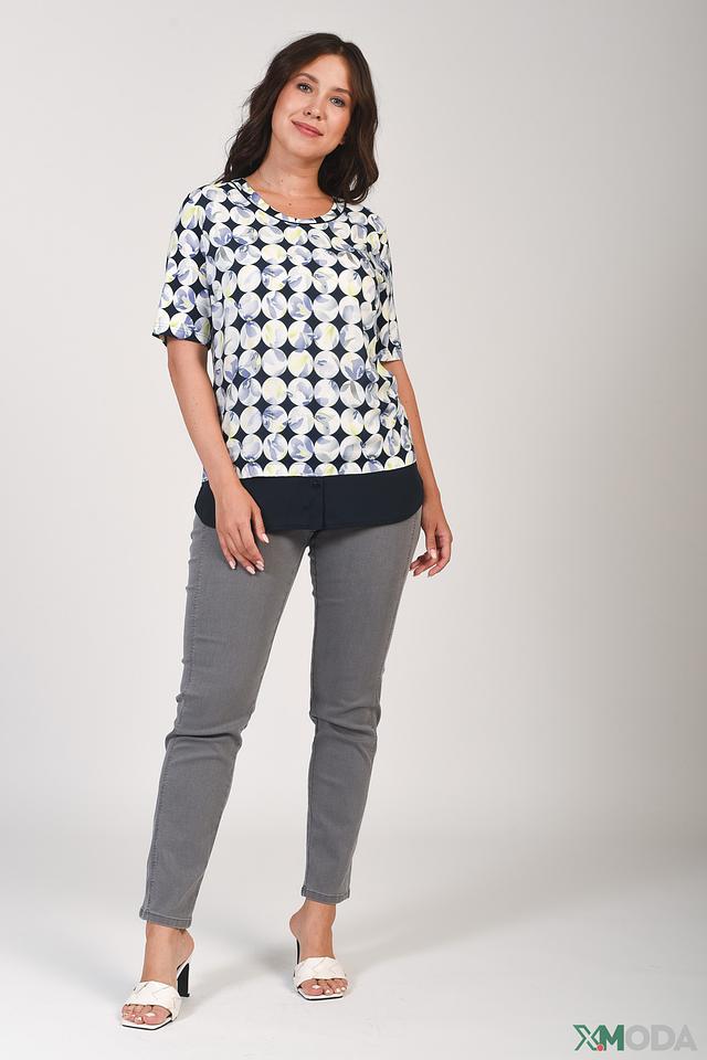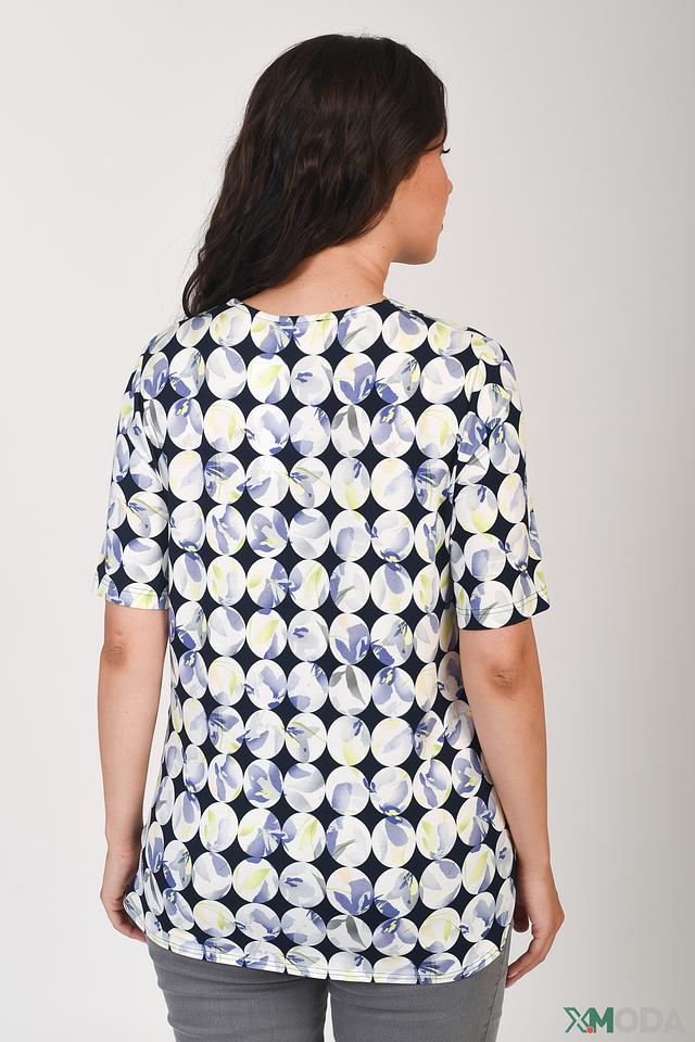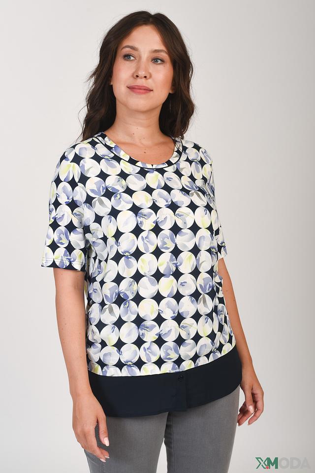 Особенностью данной модели является яркий и оригинальный цветочный принт, выполненный в синих, белых и желтых тонах. Круглый вырез горловины и короткие рукава делают блузу идеальным выбором для теплого времени года.