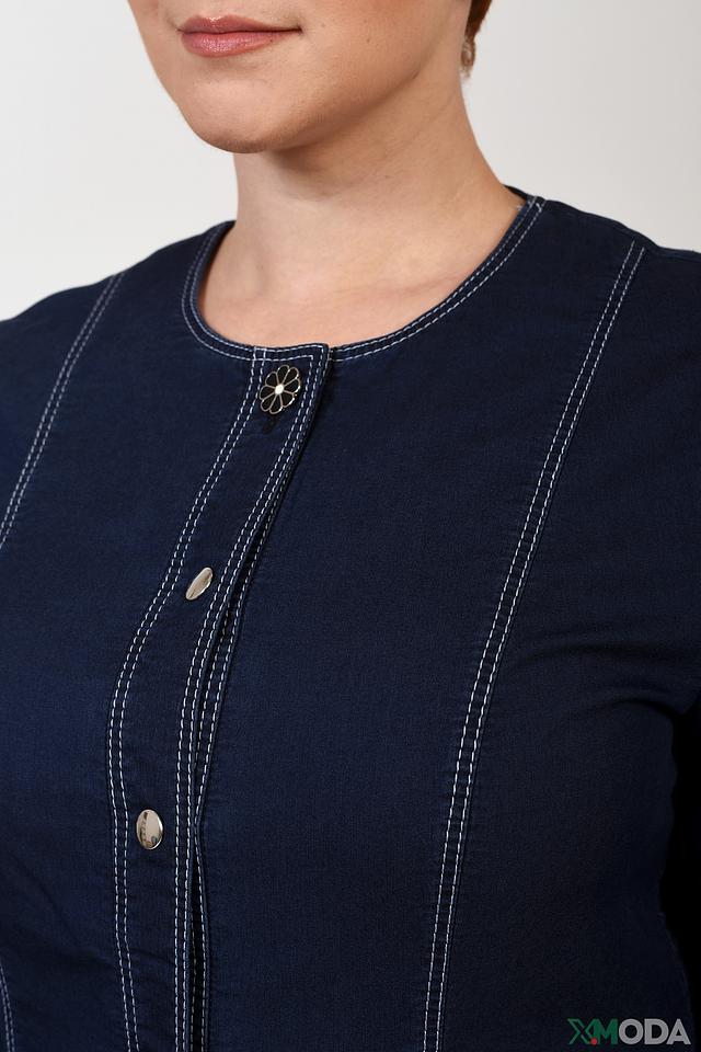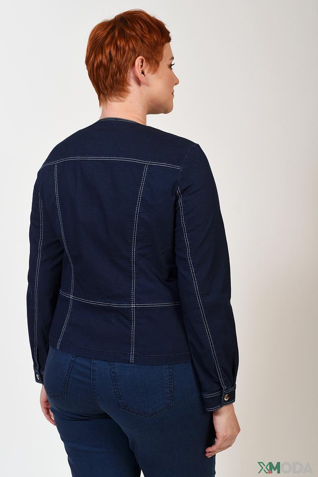 Жакет застегивается на ряд пуговиц в тон изделия, а его особенностью является контрастная светлая отделка по швам, карманам и планкам, что придает ему особый шарм.