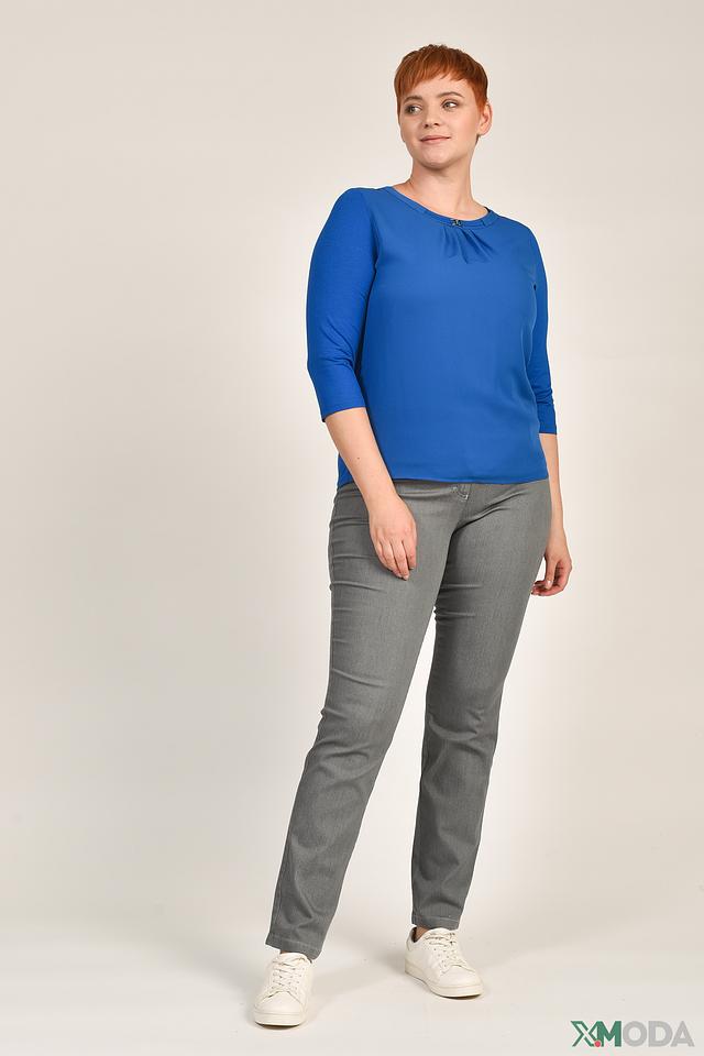 Блуза имеет классический крой с коротким рукавом 3/4 и округлым вырезом горловины. Особый акцент сделан на декоративную драпировку в области горловины, которая придает изделию изысканность и женственность.