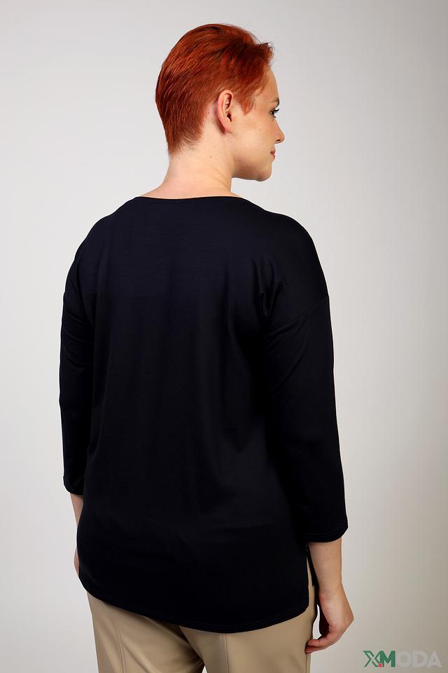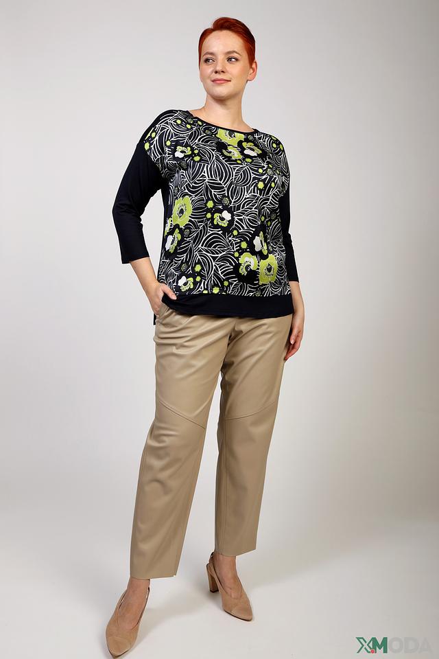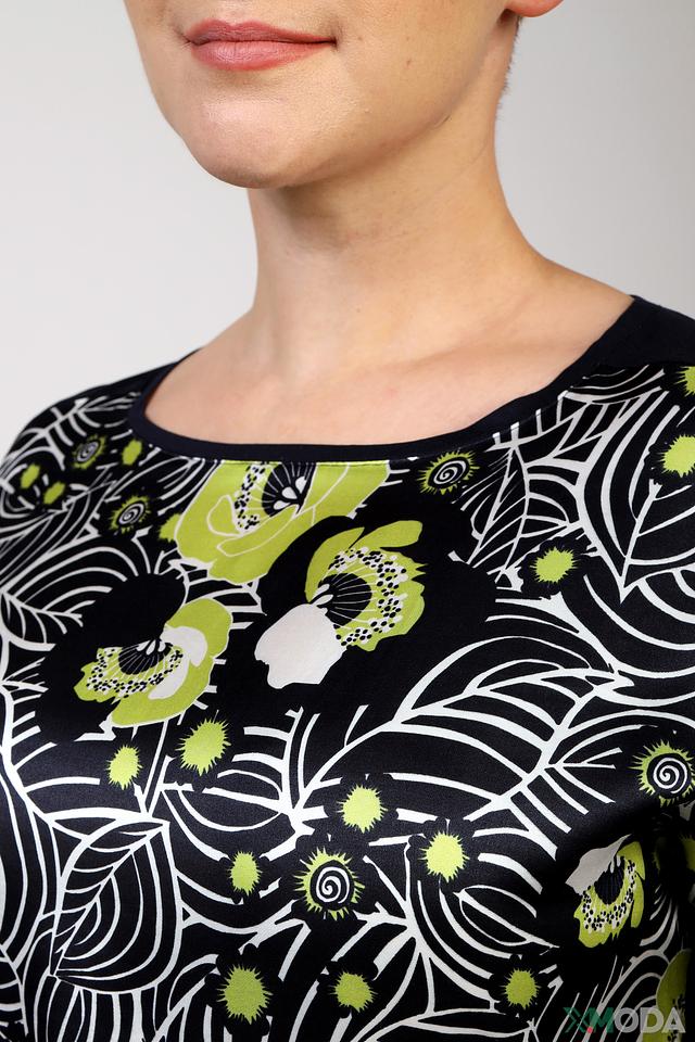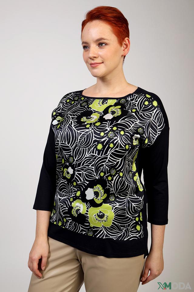 Лонгслив имеет прямой крой и ¾ рукава, что делает его универсальным для разных типов фигур. Основной цвет – черный, который служит идеальным фоном для яркого цветочного принта, состоящего из абстрактных цветов и листьев в зеленых и белых тонах.