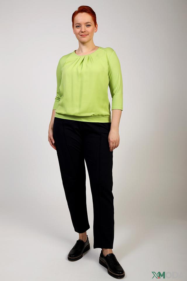 Особенностью модели является драпировка на горловине, которая придаёт блузе изысканность и женственность. Блуза имеет удобный крой и длину до бедра, что делает её универсальной для создания различных образов.
