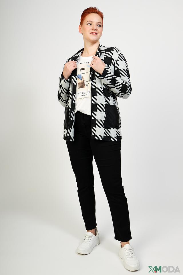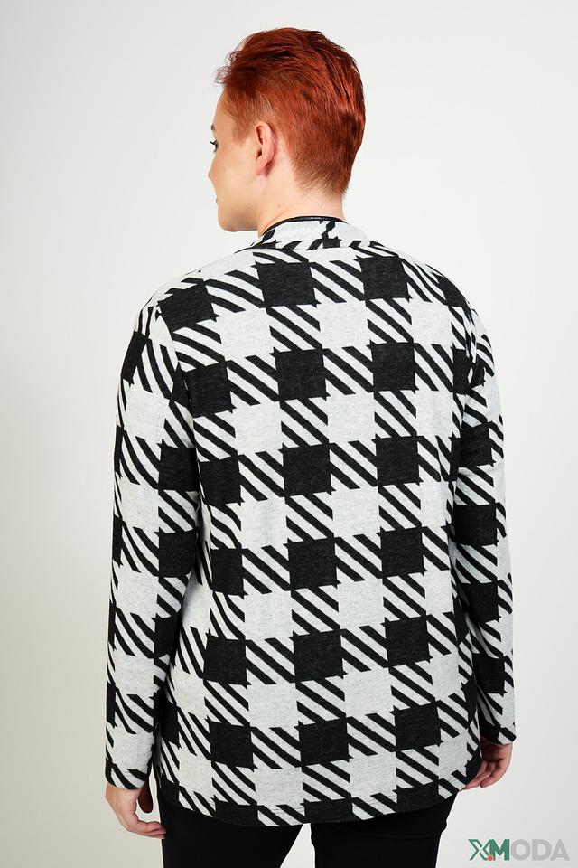 Основной цвет жакета – чёрно-белый, с выразительным геометрическим принтом в клетку. Сочетание этих цветов делает жакет универсальным и легко сочетаемым с различными элементами гардероба.