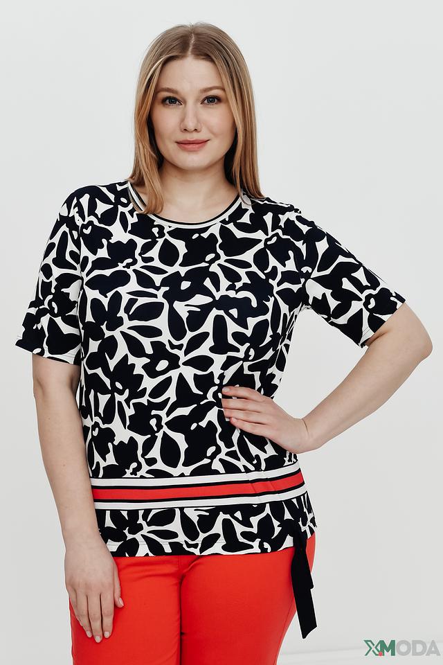 Блуза имеет оригинальный принт в виде абстрактных цветов чёрного цвета на белом фоне. Нижняя часть блузы украшена широкой красной полосой, которая добавляет образу яркости и динамики.