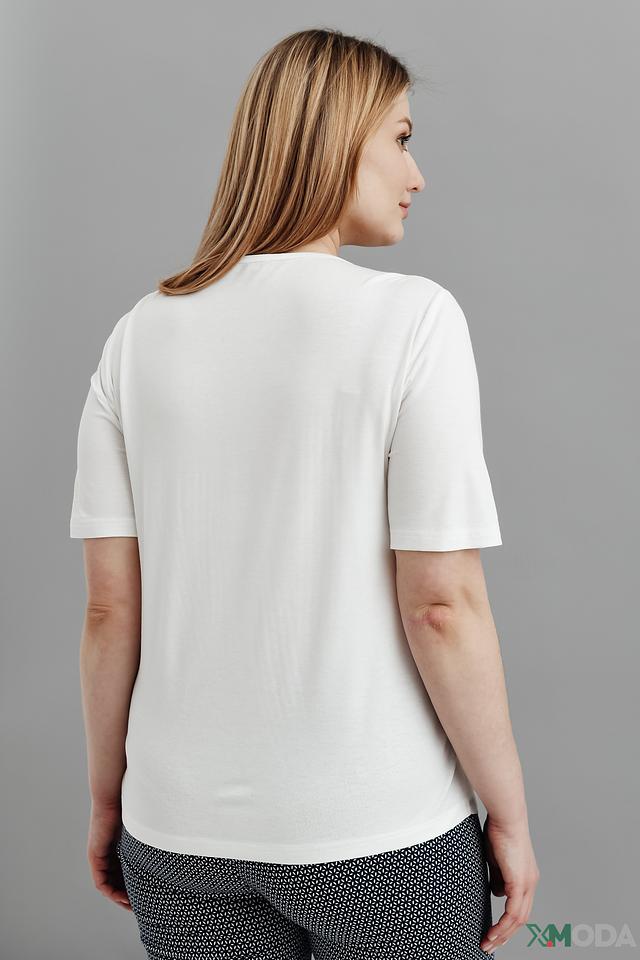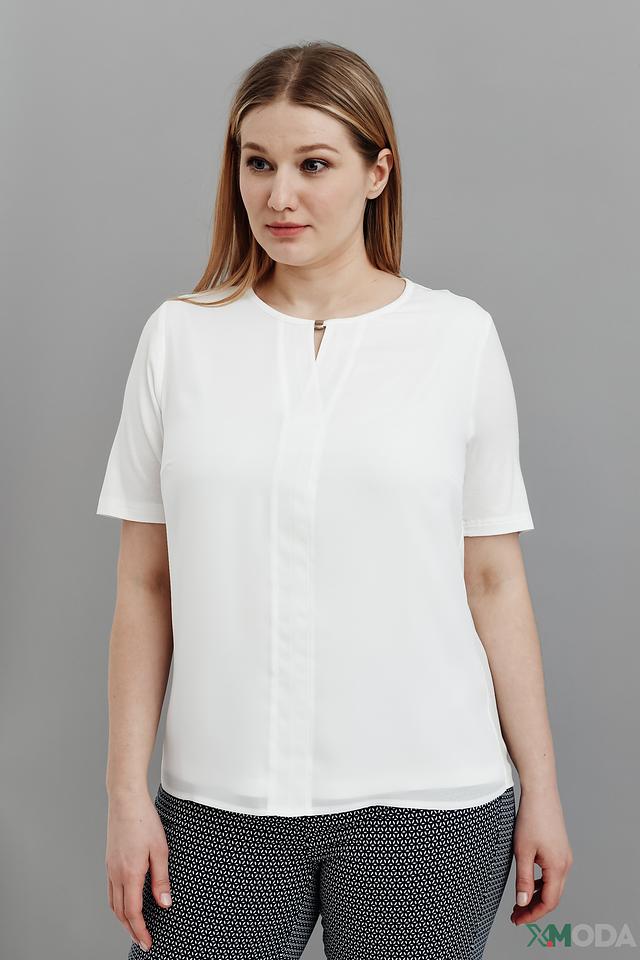 Модель имеет прямой крой, короткие рукава и V-образный вырез с небольшой декоративной вставкой. Блуза выполнена из высококачественной вискозы с добавлением эластана (93% вискоза, 7% эластан), что обеспечивает мягкость, комфорт и хорошую посадку по фигуре.