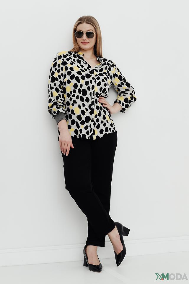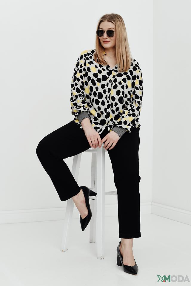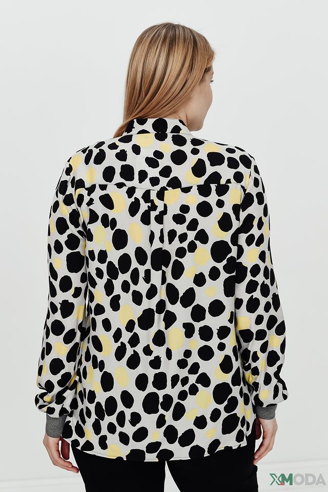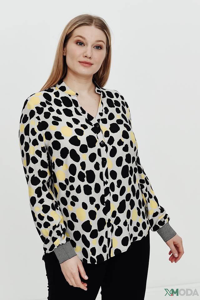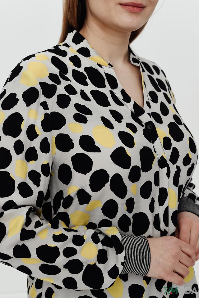 Особенностью данной модели является яркий и необычный принт в виде пятен чёрного и жёлтого цветов на сером фоне. V-образный вырез горловины добавляет образу женственности и элегантности. Длинные рукава блузы заканчиваются манжетами в тон основной ткани.