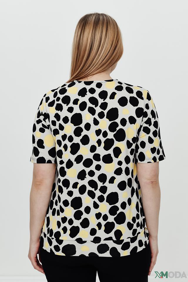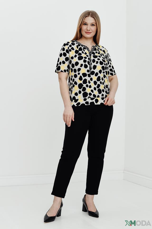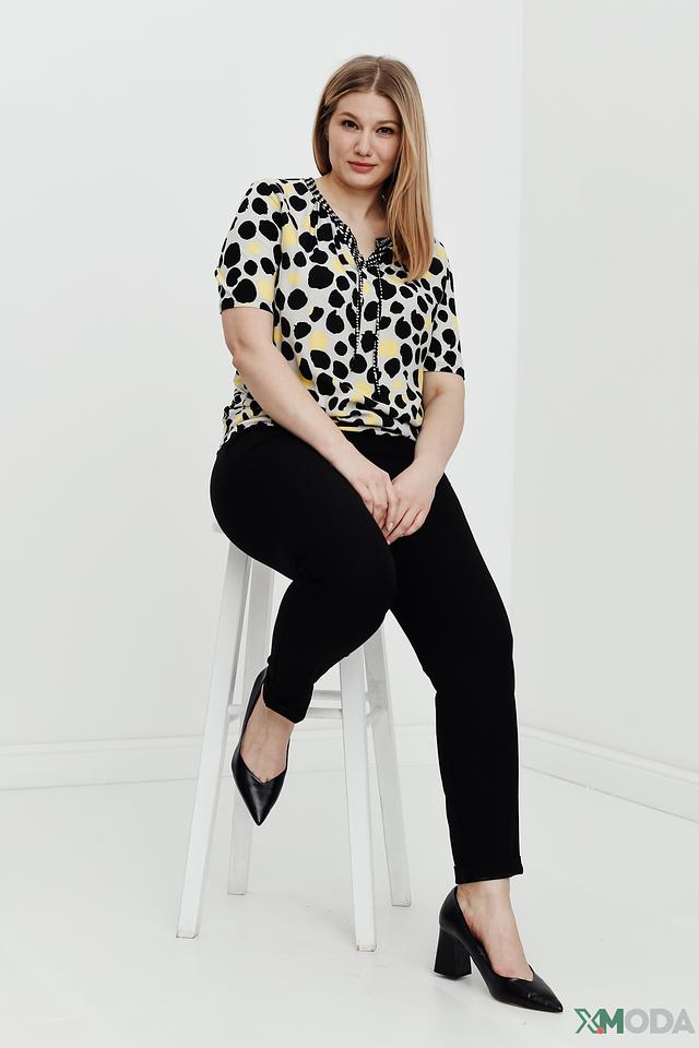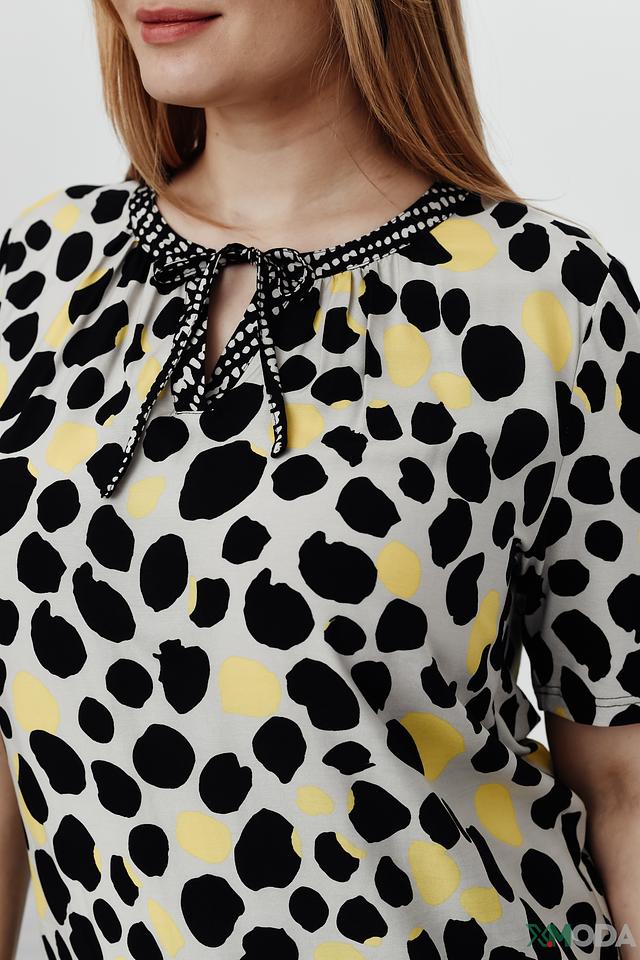 Особенностью данной модели является оригинальный принт в виде разноцветного горошка – сочетание черного, желтого и серого цветов придает блузе игривость и неповторимость. Блуза прекрасно сочетается с брюками, юбками и джинсами, позволяя создавать разнообразные стильные комплекты.