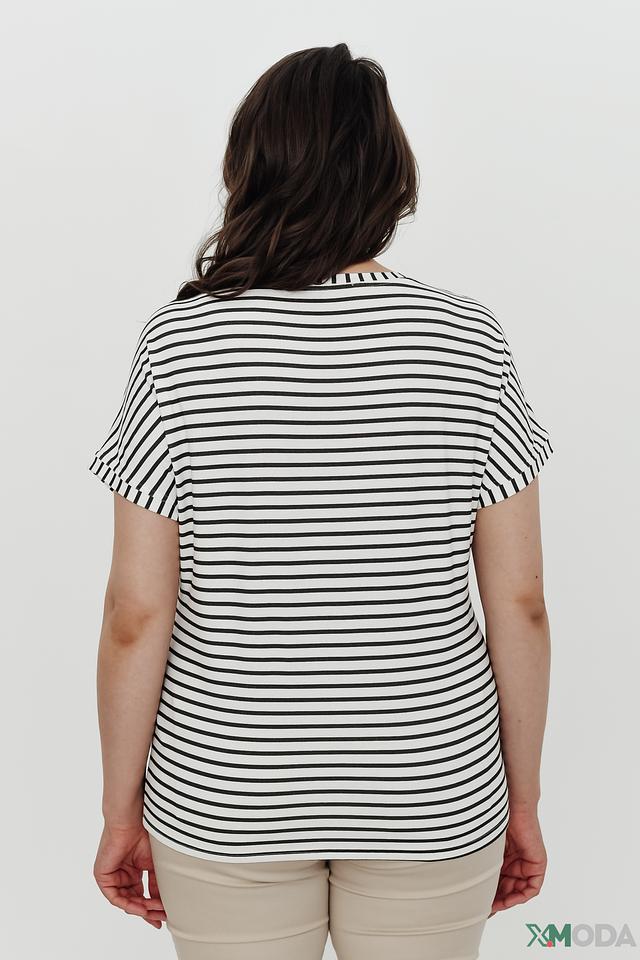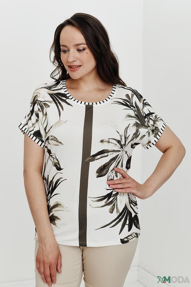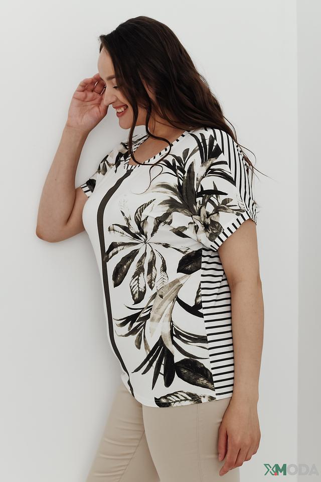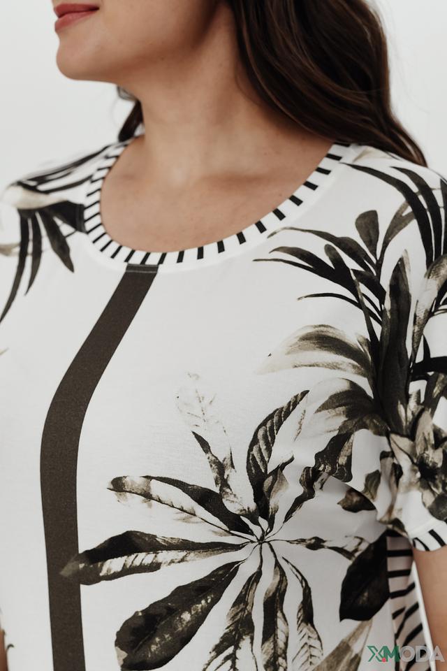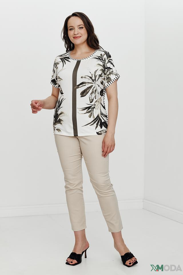 Модель имеет свободный крой, который не сковывает движений и обеспечивает комфорт в течение всего дня. Короткие рукава и округлый вырез горловины придают блузе лёгкость и непринуждённость. Вертикальная вставка тёмно-серого цвета визуально вытягивает силуэт.